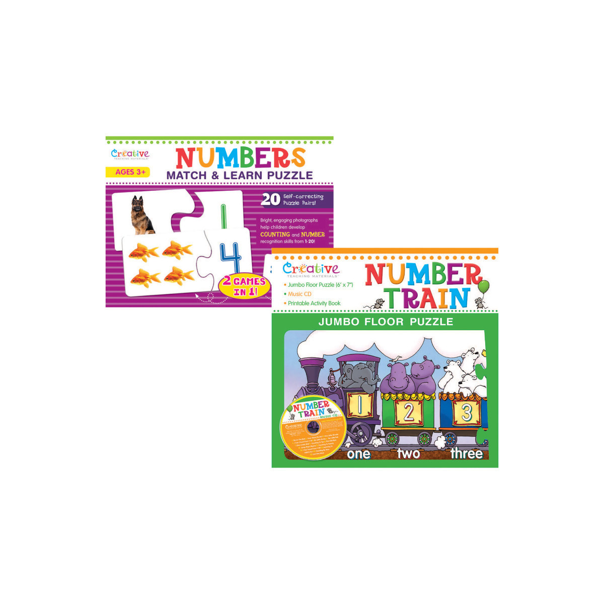 Introduce young learners to numbers and counting with the Numbers Puzzle Bundle, Set of 2, featuring the Number Train Jumbo Floor Puzzle and Numbers Match & Learn Puzzle. The Number Train Jumbo Floor Puzzle is a giant 6-foot-long puzzle that helps kids learn numerals, number words, and counting from 1 to 20, with 27 sturdy, oversized pieces for interactive fun. It also includes a sing-along CD to make learning numbers engaging, plus a downloadable activity book with tracing, worksheets, and lyrics. The Numbers Match & Learn Puzzle reinforces counting with self-correcting pieces that match numbers to corresponding images, promoting independent learning. This bundle provides a fun, hands-on way for kids to build foundational math skills.