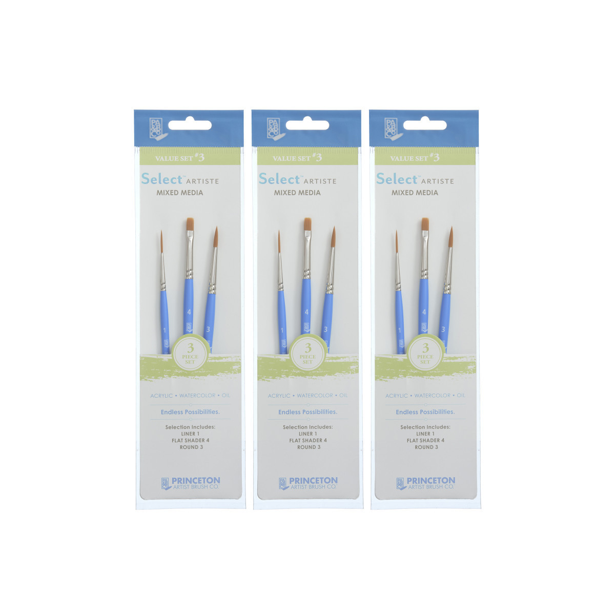 Princeton Select Artiste Brush Set No. 3, Synthetic Bristles, Short Handle Mixed Media Paintbrush, Jewel Blue, 3 Per Set, 3 Sets
