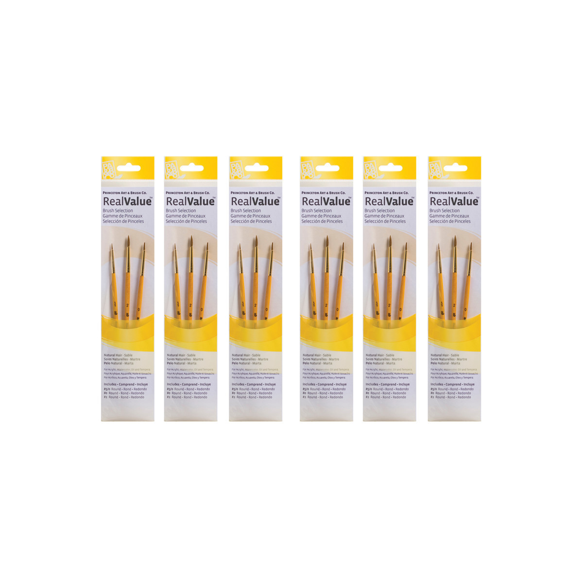 Princeton Artist Co. proudly presents the RealValue paintbrush collection—a curated series of meticulously selected brush sets that cater to every artistic need. Whether you prefer short-handle or long-handle styles, natural, synthetic, or a blend of bristles, the RealValue collection offers an unparalleled range of shapes and sizes. Designed to meet the demands of artists across all mediums—acrylic, watercolor, tempera, and oil—these brushes deliver exceptional mixed media performance at an incredible value. With RealValue, you'll find the perfect brush set to elevate your craft, whether you're just beginning or are a seasoned professional. Each set includes 3 brushes. Sold as 6 sets for a total of 18 brushes.