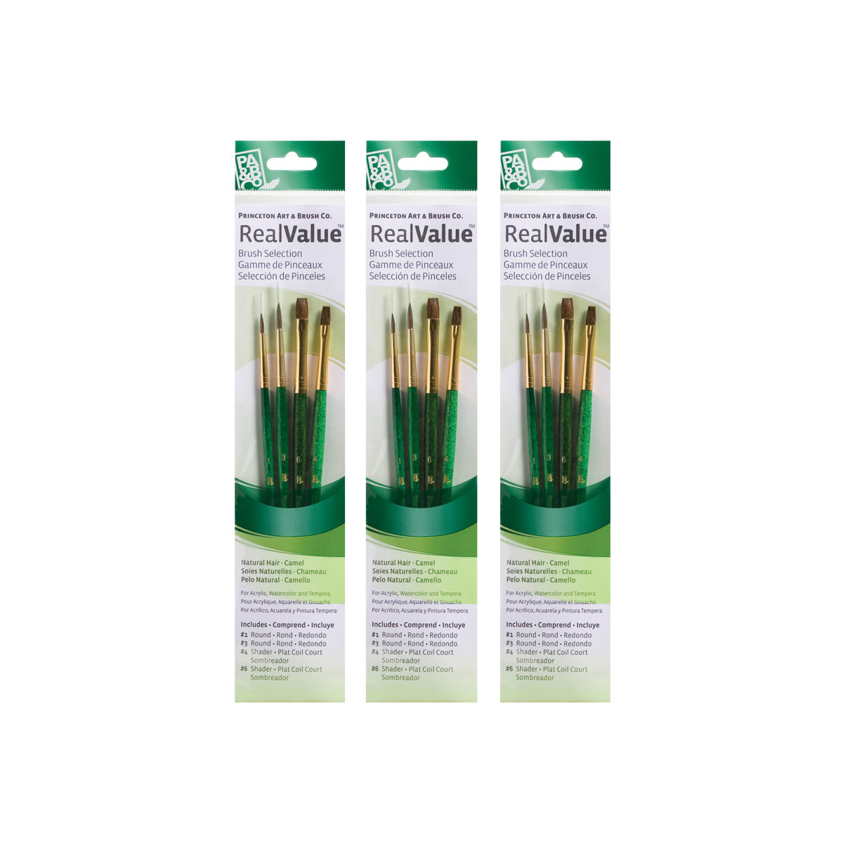 Princeton RealValue Brush Set, Camel Bristles, Short Handle Mixed Media Paintbrush, Green, 4 Per Set, 3 Sets
