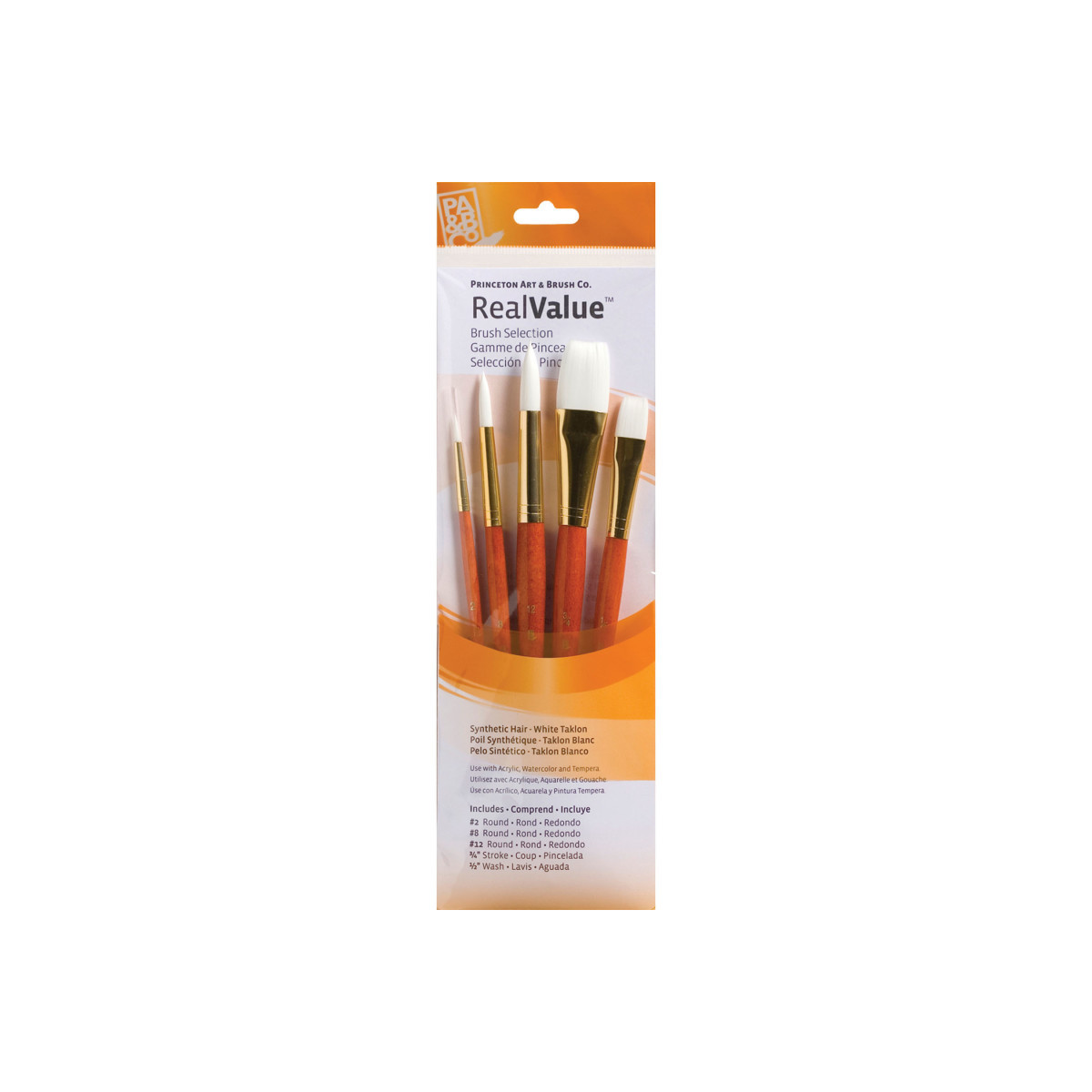 Princeton RealValue Brush Set, White Taklon Bristles, Short Handle Mixed Media Paintbrush, Orange, 5 Pieces