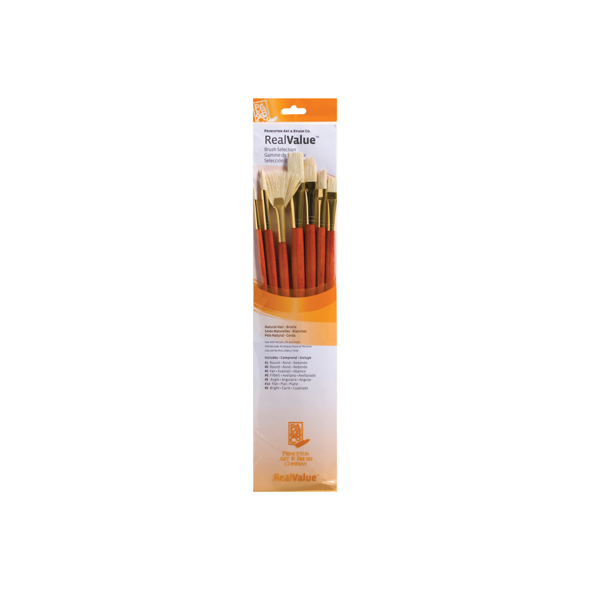 Princeton RealValue Brush Set, Natural Bristles, Long Handle Mixed Media Paintbrush, Orange, 7 Pieces