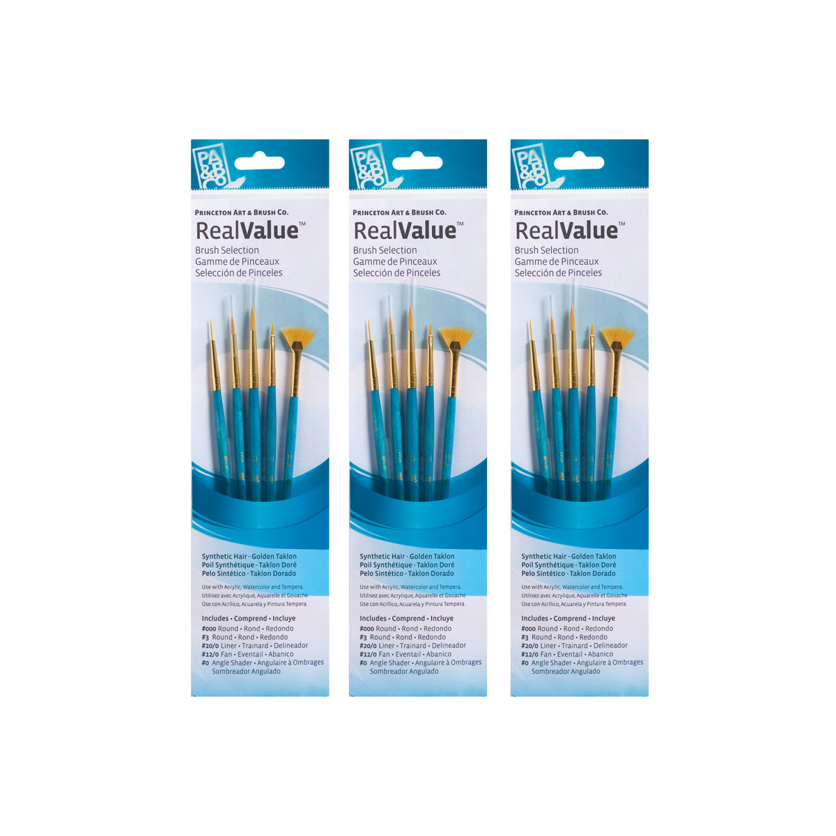 Princeton RealValue Brush Set, Gold Taklon Bristles, Short Handle Mixed Media Paintbrush, Blue, 4 Per Set, 3 Sets