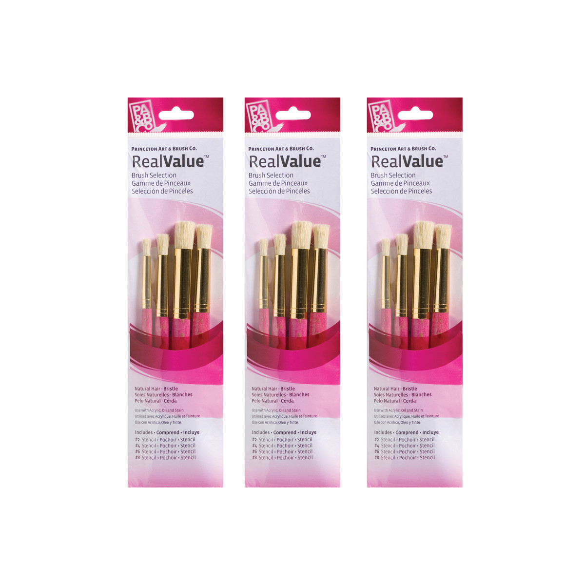Princeton RealValue Stencil Brush Set, Natural Bristles, Short Handle Mixed Media Paintbrush, Pink, 4 Per Set, 3 Sets