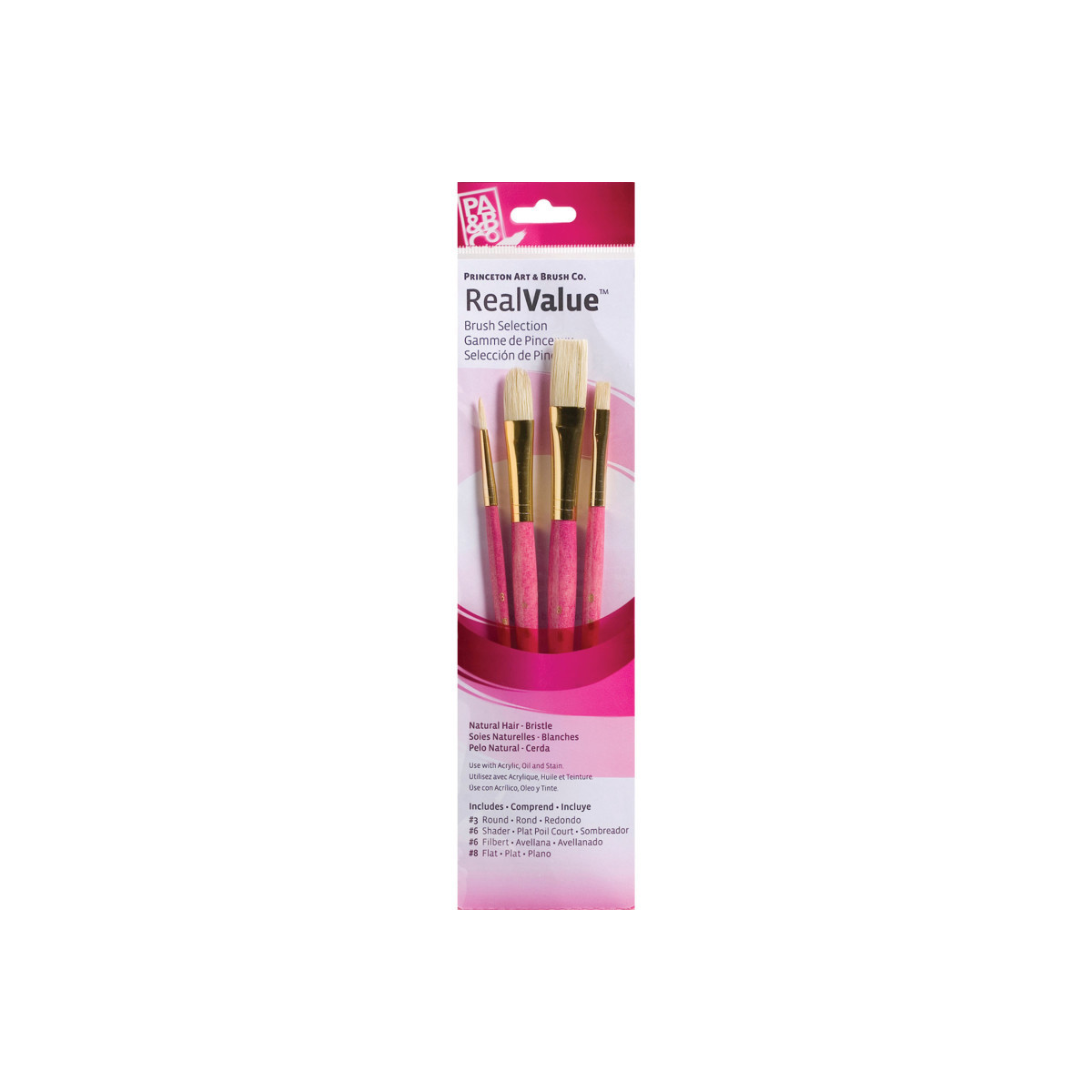 Princeton RealValue Brush Set, Natural Bristles, Short Handle Mixed Media Paintbrush, Pink, 4 Pieces