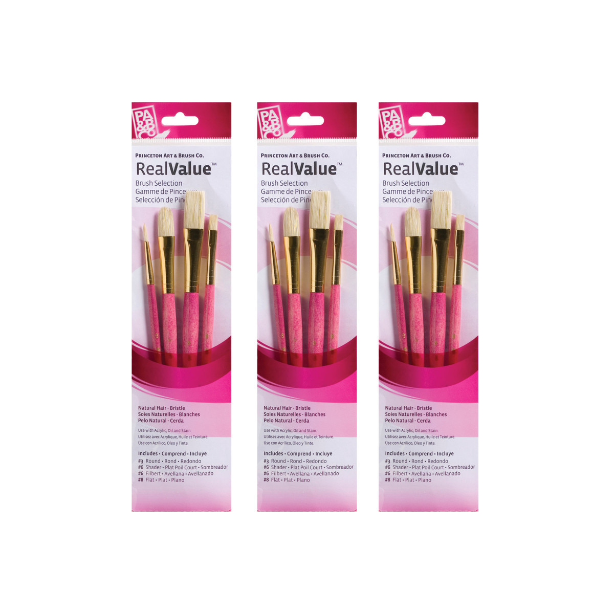 Princeton RealValue Brush Set, Natural Bristles, Short Handle Mixed Media Paintbrush, Pink, 4 Per Set, 3 Sets