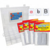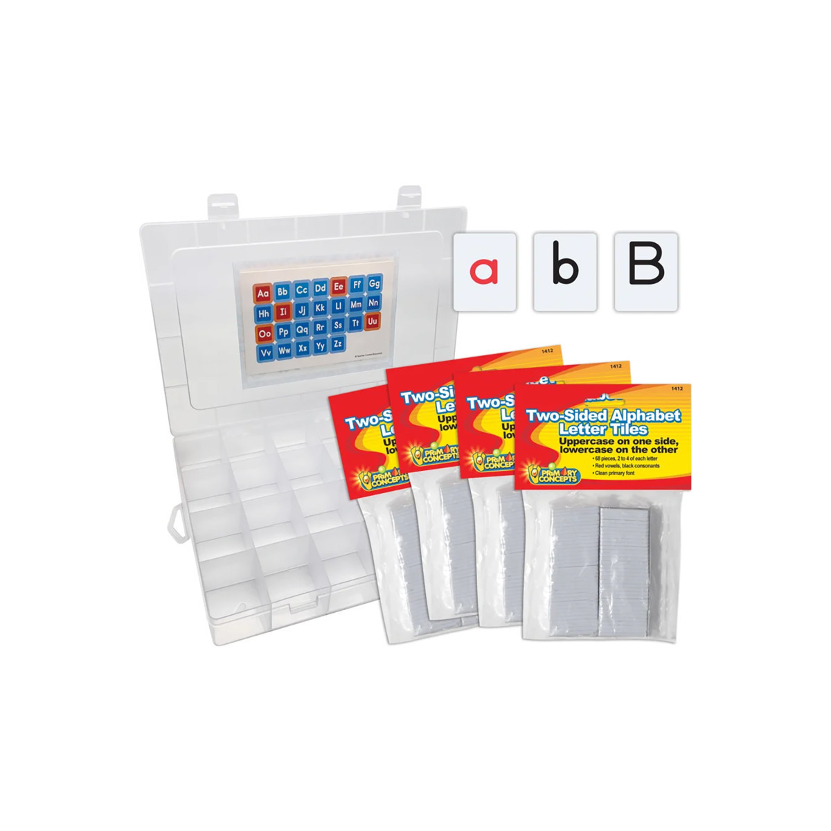 Plastic letter tiles measure 1" by 1-1/4". Lowercase on one side, uppercase on the other. Four sets of Two-Sided Alphabet Letter Tiles for word building activities. 272 tiles in all, in a convenient Letter Tile Organizer.