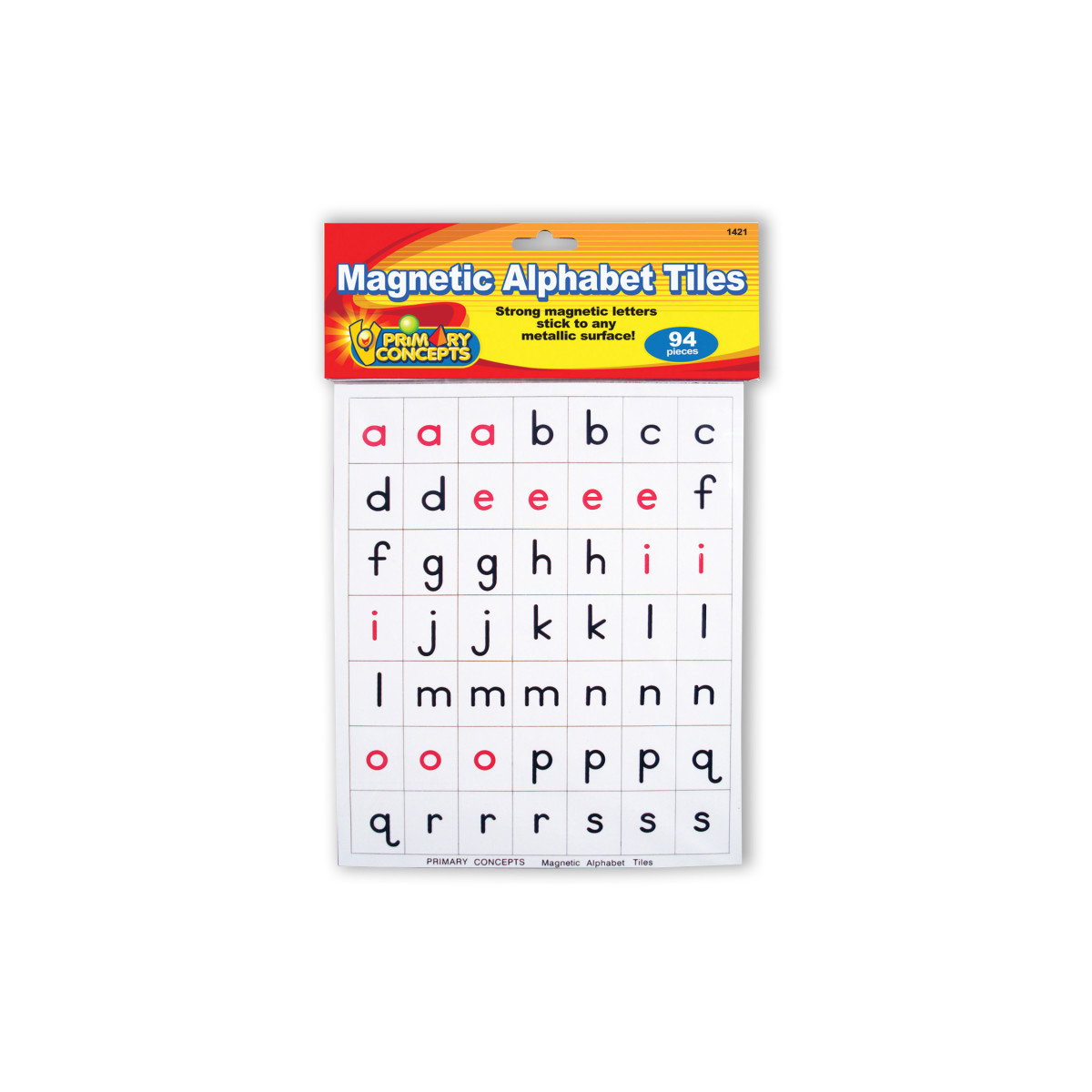 These specially designed Magnetic Alphabet Letter Tiles have the letters printed right on the magnetic surface. No glued paper to peel off. You get between 2 and 4 of each lowercase letter tile, and 26 uppercase letter tiles. 92 letters in all, plus two apostrophes. Red vowels and black consonants.