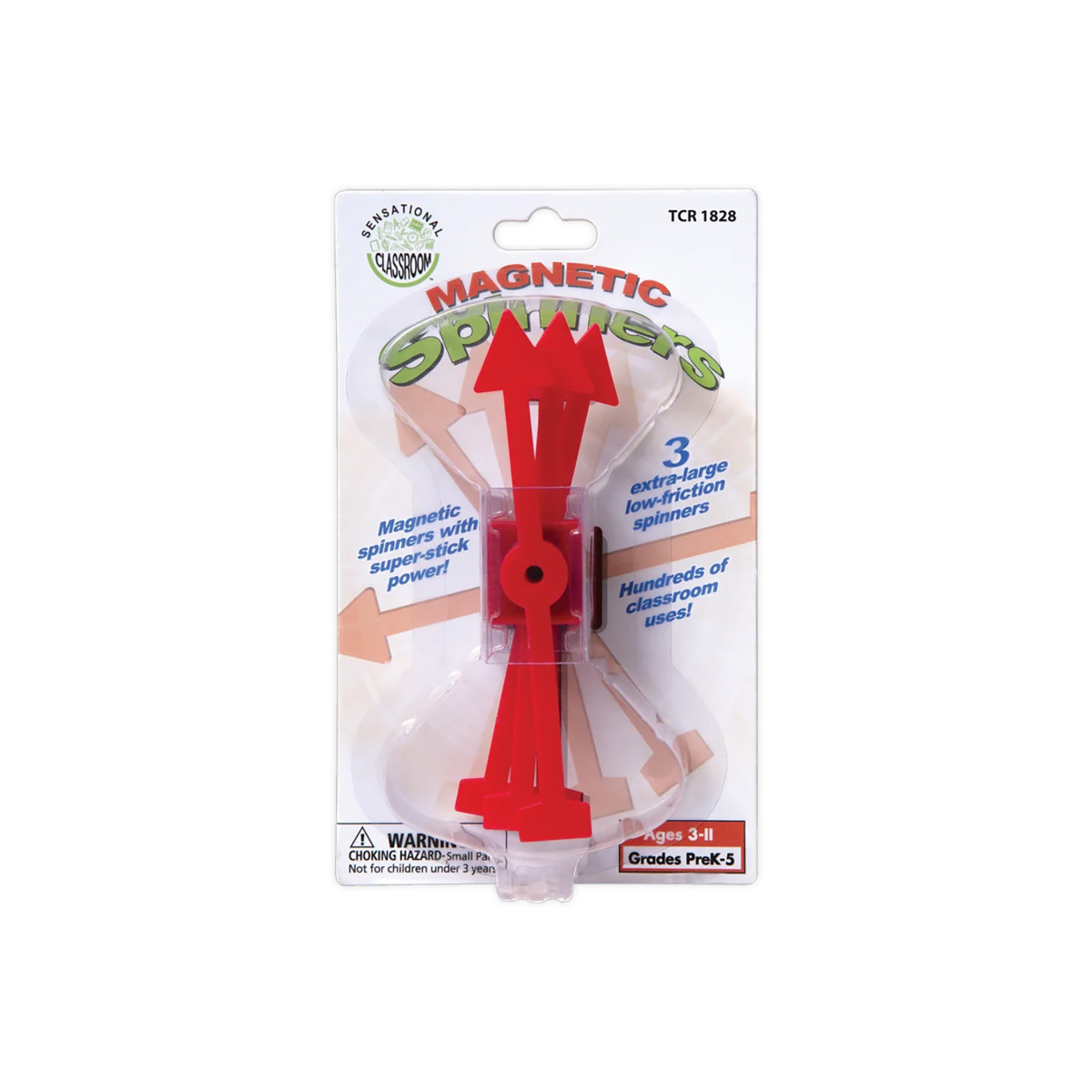 Want to play some spinner games with the whole class or small groups? These three 5" jumbo spinners have strong magnetic bases, making them ideal for creating spinner games on a magnetic white board. Choose players with a spin. Choose any information to start the game with a quick spin at the board. Works great on any magnetically receptive surface. Each pack includes 3 spinners.