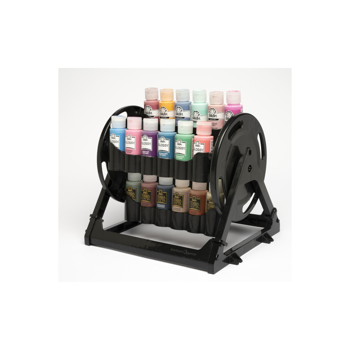 The Plaid Rotational Organizer is the perfect way to keep your craft studio neat and tidy. This handy acrylic paint rack holds up to 24 standard 2 oz bottles of your favorite FolkArt or Apple Barrel Acrylic Paint colors. You can easily and systematically use each section to organize your paints by color palette or store your favorite acrylic paint set. This compact and easy-to-use organizer can easily be mounted on a wall, used on a tabletop, or under a cabinet. Simply snap together this portable organizer to effortlessly transport your favorite colors from one project to the next. This durable and lightweight storage unit is a must-have product in your art supplies to keep your acrylic paints organized any time creativity strikes.