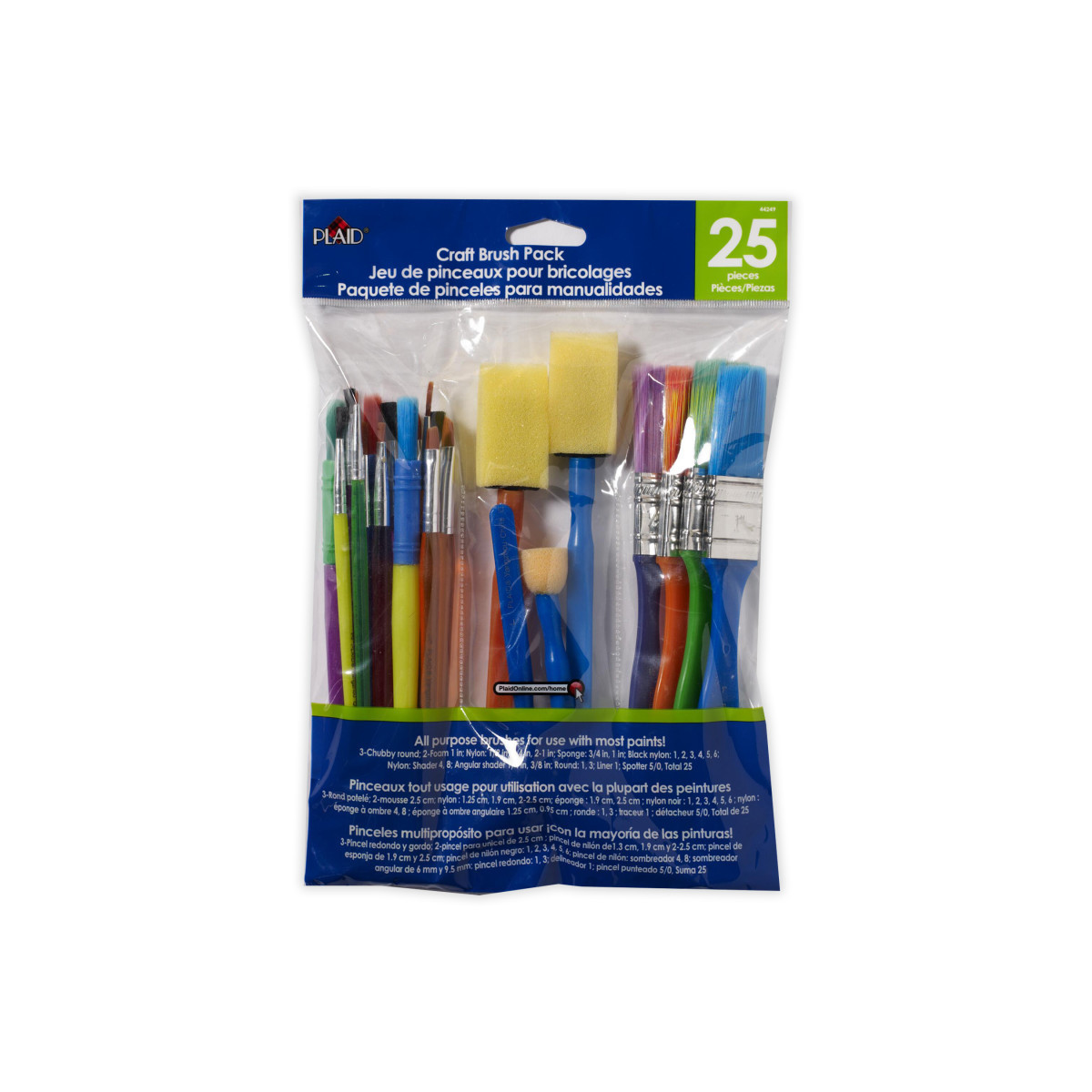 Create beautiful painted artwork using the Plaid 25-piece Craft Paint Brush Set. This pack contains 25 paint brushes of all shapes and sizes and bristles. This pack contains foam brushes, plastic and wooden-handled brushes, short and long bristle brushes, and so much more. With this pack, you have everything you need to complete any size arts and crafts project big or small. Upgrade your art supplies with this set of unique paint brushes to fit every need. Make sure to clean while wet with soap and water immediately after painting. Then, reshape with fingers into original form to dry. Add the Plaid 25-piece Craft Paint Brush Set to your art supplies for exceptional coverage and durability.