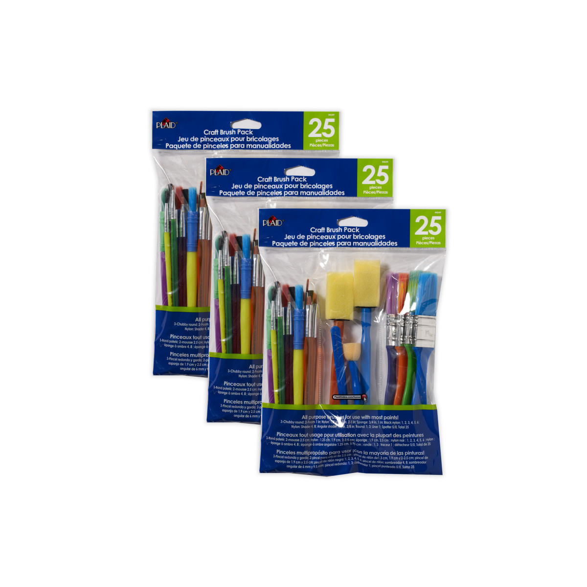 Create beautiful painted artwork using the Plaid Craft Paint Brush Set. This pack contains paint brushes of all shapes and sizes and bristles. This pack contains foam brushes, plastic and wooden-handled brushes, short and long bristle brushes, and so much more. With this pack, you have everything you need to complete any size arts and crafts project big or small. Upgrade your art supplies with this set of unique paint brushes to fit every need. Make sure to clean while wet with soap and water immediately after painting. Then, reshape with fingers into original form to dry. Add the Plaid Craft Paint Brush Set to your art supplies for exceptional coverage and durability. Each set includes 25 pieces. Sold as 3 sets for a total of 75 pieces.