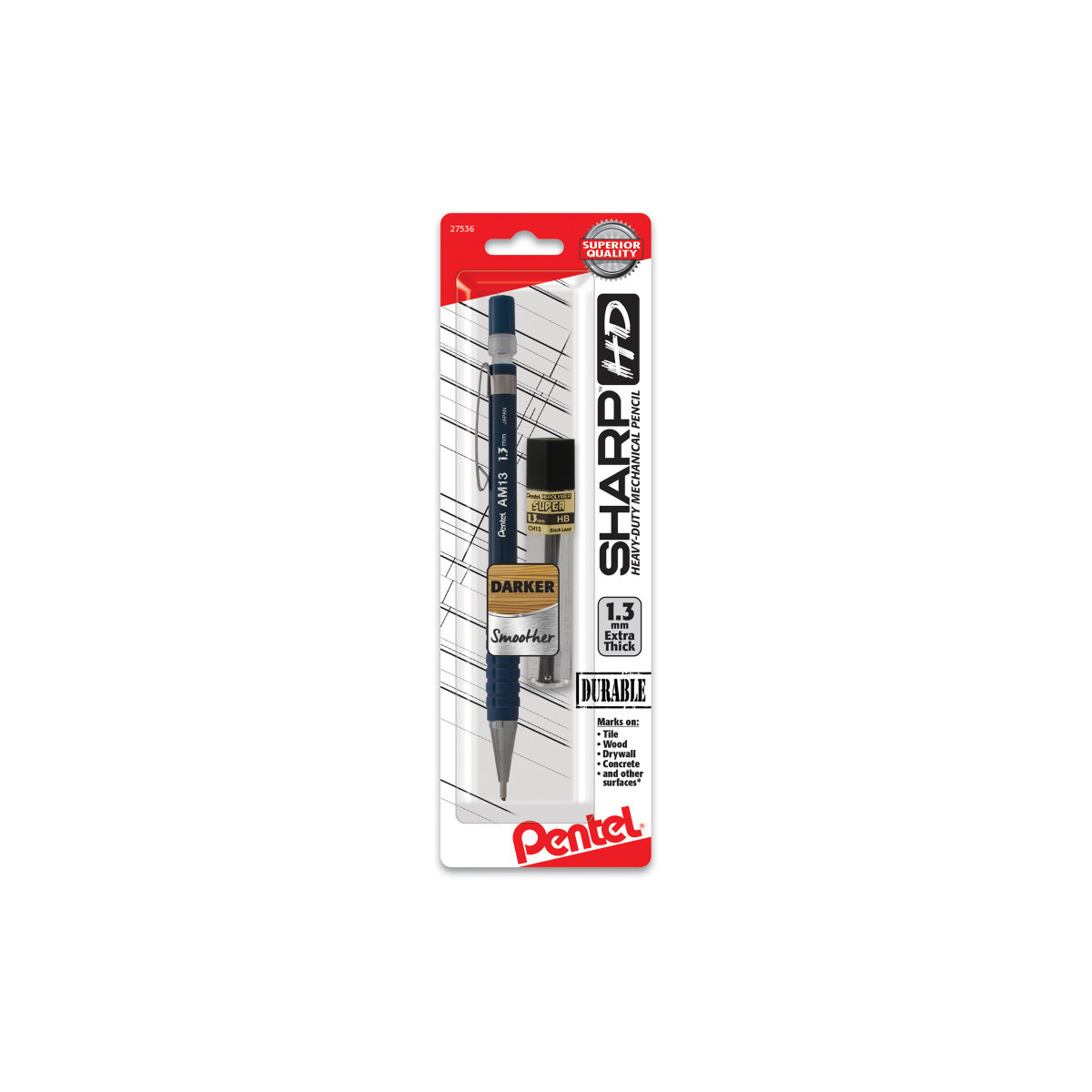 Pentel’s sharp HD Mechanical Pencil comes with strong, heavy-duty, high-quality lead that is perfect for writing, drawing, sketching, marking, puzzles and a range of other uses. Write smoother, bolder, darker lines comfortably on a variety of surfaces such as tile, wood, drywall, concrete, etc. using the extra-thick lead. Constructed with a sturdy metal clip that withstands repeated use. Features a durable metal tip and a 4mm sleeve that helps stabilize lead and prevent breakage, perfect for use with templates and rulers. Constructed with a latex-free engineered grip design for writing comfort and equipped with a sturdy metal clip that withstands repeated use. Mechanical Pencil includes a protective cap to keep high-quality Pentel eraser clean. The 1.3mm lead writes heavy-duty, extra-thick lines.
