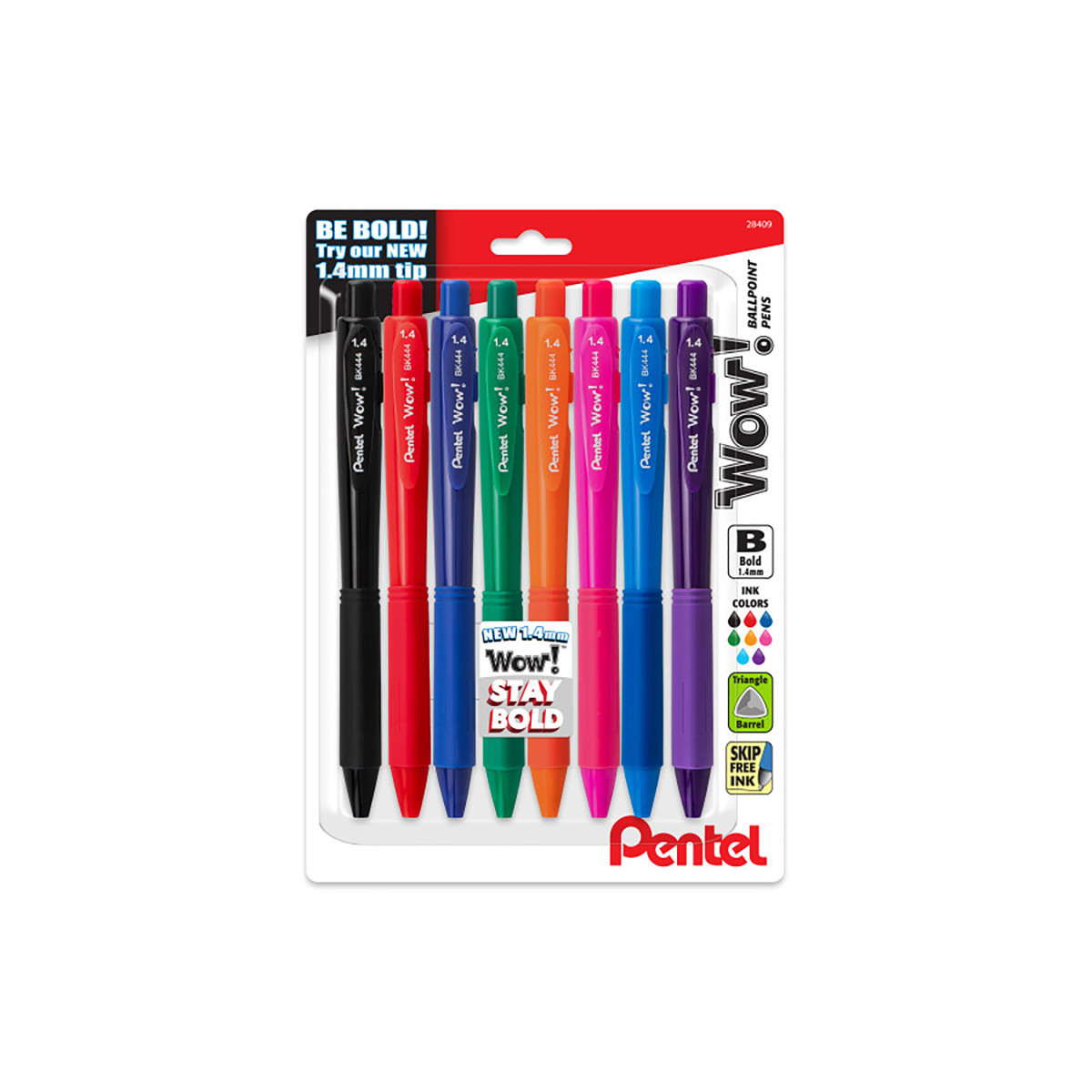 The Wow! retractable ballpoint pens triangular-shaped barrel and latex-free grip is easy to hold and doesn't roll off desks. 1.4mm metal tip writes bold lines. Distinctive design stands out in a crowd. Maximum comfort and control with the latex-free grip. Each pack includes 8 pens in assorted ink colors: black, blue, red, green, violet, orange, pink, and sky blue.