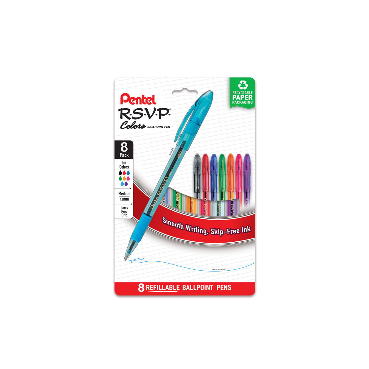 The Pentel RSVP Colors ballpoint pen is a sturdy, well-balanced pen. This capped pen is designed for extended periods of use. The exclusive Comfort Zone, latex-free grip is designed to reduce writing fatigue. The colored barrel matches the ink supply inside. Durable stainless steel tip delivers a consistent line without skipping. The 1.0mm writes medium lines. The long barrel holds more ink than the competition and can write for almost a mile! Uses BKL7/BKL10 refills. Each pack includes 8 pens in assorted ink colors.