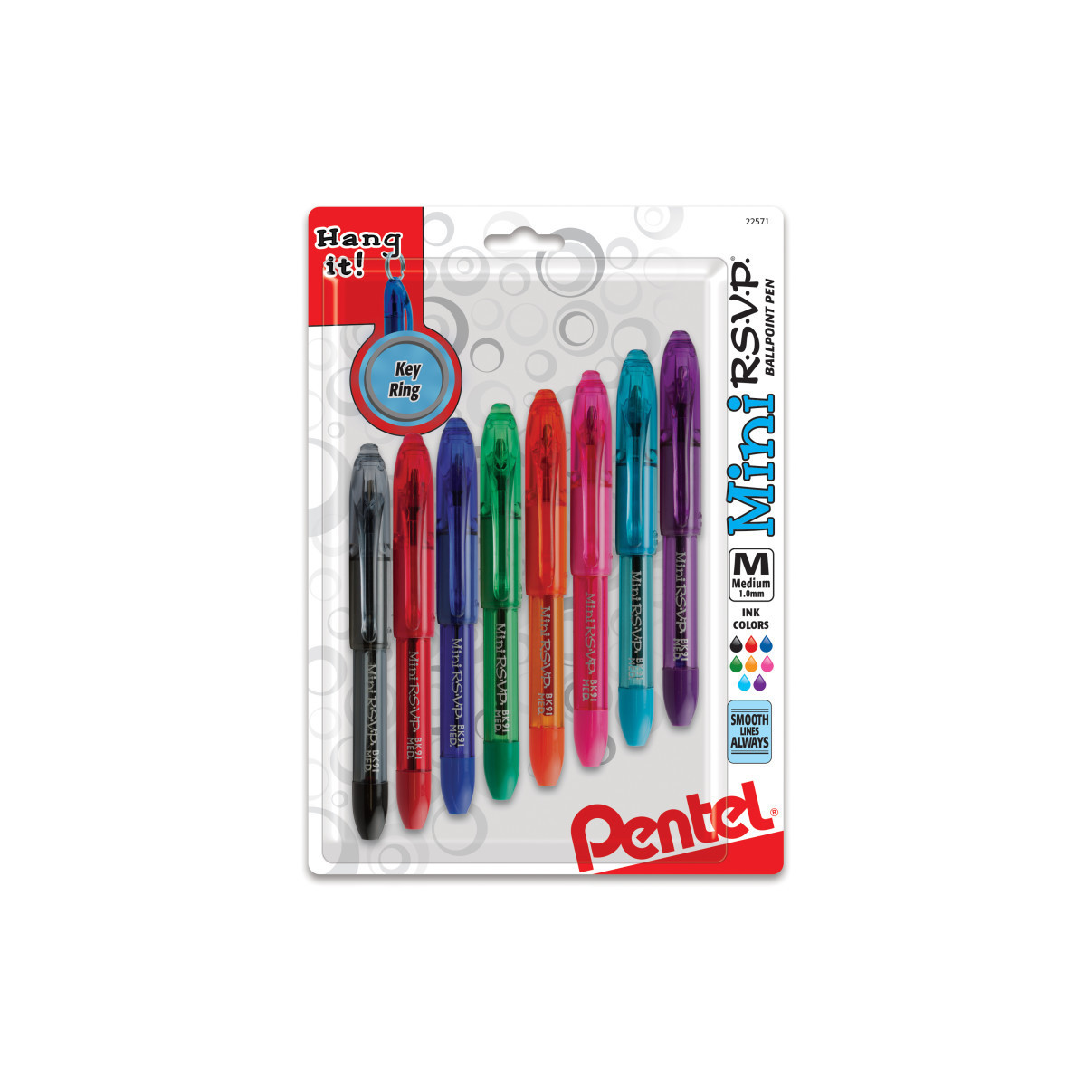 Never lose your pen again! Attach your Mini RSVP to a lanyard, backpack, small notebooks, pockets, purses and more. Writes smooth medium lines. Comfort Zone™ latex free grip. Each pack includes 8 pens in ink colors with brightly colored barrels – ink matches barrel color.