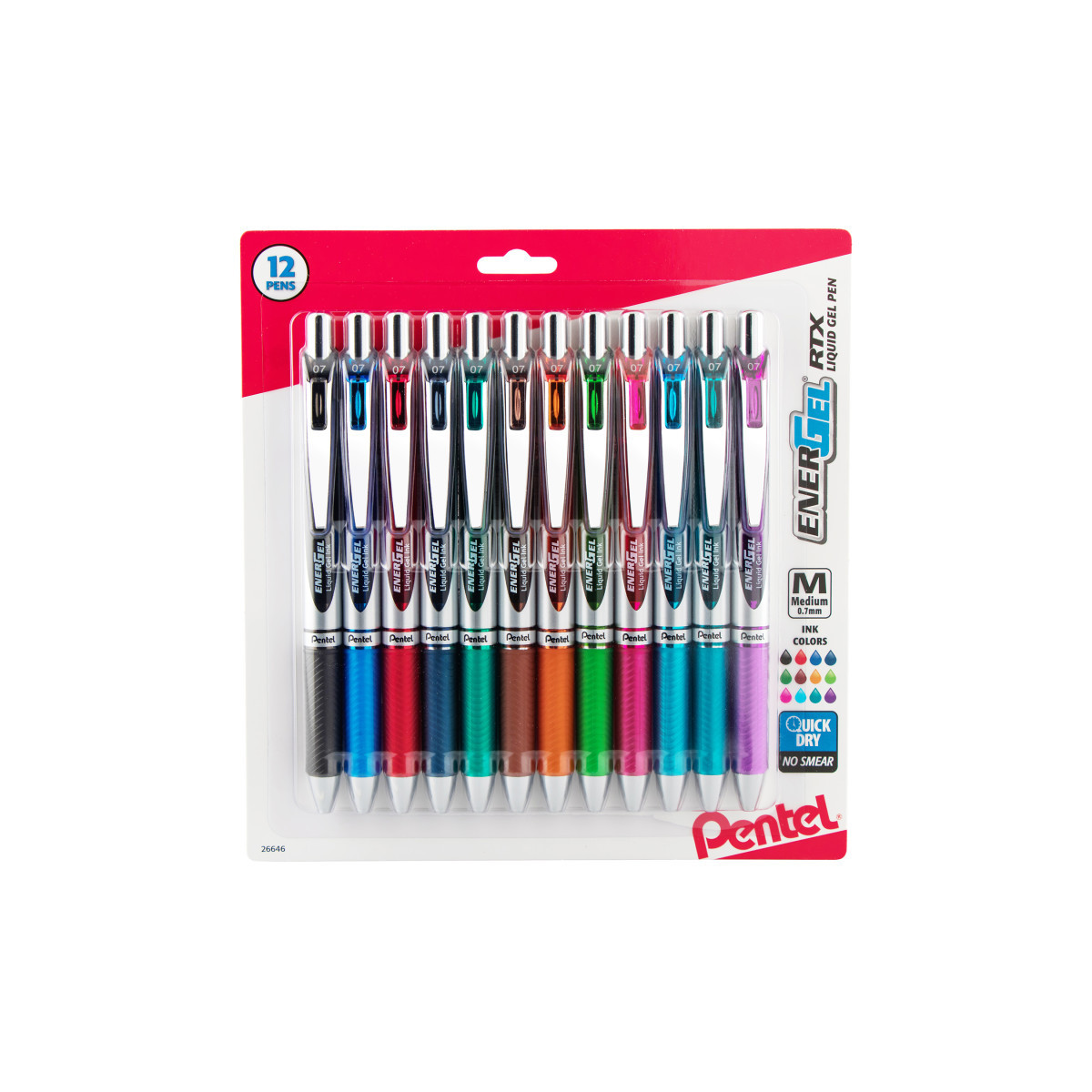EnerGel RTX provides a smooth writing experience. Fast-drying liquid gel ink. Great for left handers - no smears, no smudges, no globs. Latex-free grip. 0.7mm tip writes medium lines. High performance ink technology combines the best qualities of liquid and gel ink for a super-smooth writing experience. Sleek & stylish barrel design with metal accents for a professional look. Each pack includes 12 pens in assorted ink colors.