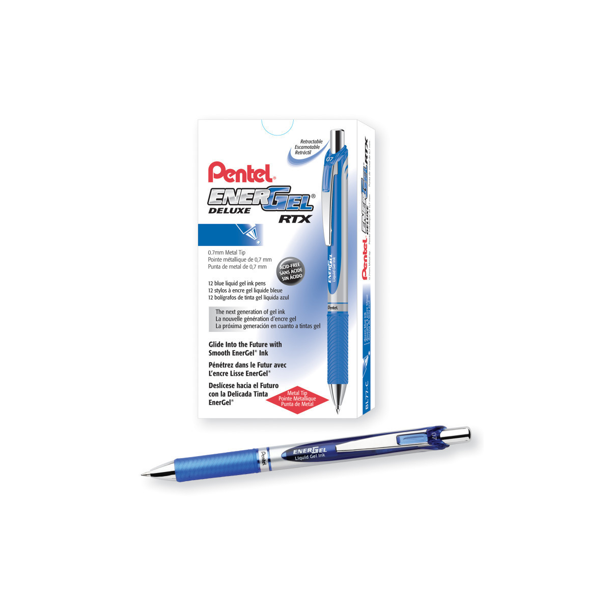 Pentel® EnerGel RTX Retractable Liquid Gel Pen, (0.7mm) Metal Tip, Medium Line, Blue Ink, 1 Dozen