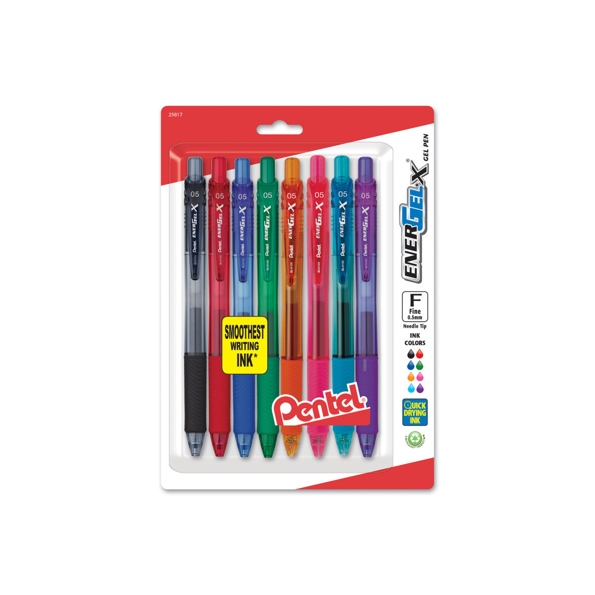The Pentel EnerGel-X retractable gel pen provides a smooth, effortless writing experience at a great price. High performance ink technology combines the best qualities of liquid and gel ink, and dries so fast even left handers love it - No Smears, No Smudges, No Globs. Stylish barrel colors match the ink inside for quick and easy color selection. The latex-free grip provides extended comfort and control when writing. It is available with a 0.5mm needle tip that writes fine lines and is refillable with any size and/or color of EnerGel refill. Each pack includes 8 pens in assorted ink colors: Black, Red, Blue, Green, Orange, Pink, Sky Blue and Violet.