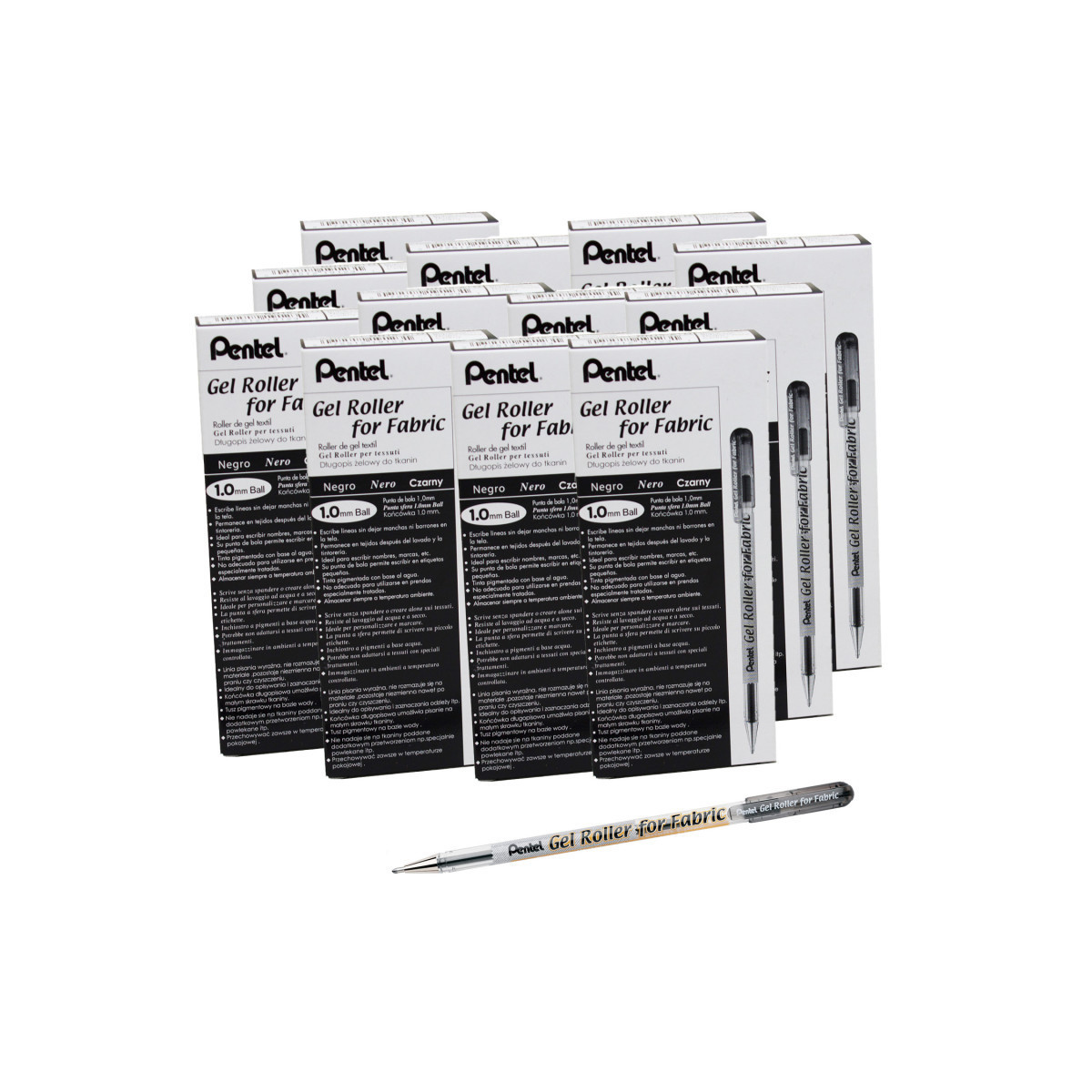 Permanent, waterproof, acid-free gel ink for fabric. 1.0mm tip produces distinct, bold lines. Water-based pigment withstands repeated washings, even dry cleaning. Ideal for use on linen, canvas, denim, cotton, and most all-natural fabrics. AP certified by ACMI. Sold as a pack of 12 pens.
