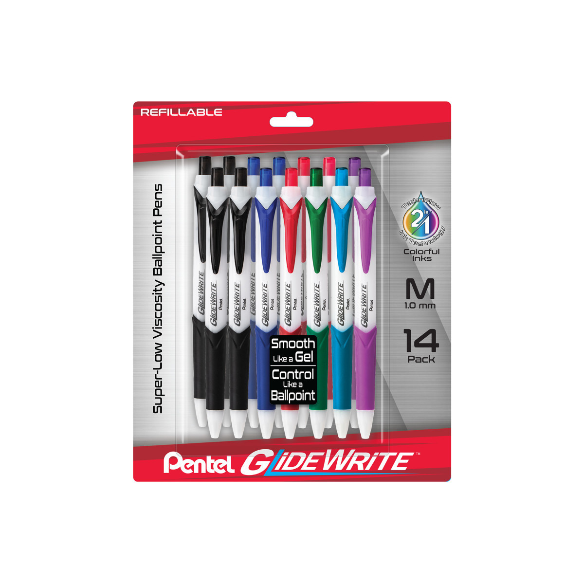 Elevate your writing to the next level with GlideWrite super-low-viscosity ballpoint pens. 2 in 1 ink formula combines the smoothness of a gel with the control of a ballpoint. Advanced breakthrough ink formula - TechniFLO, is a super-low-viscosity ink that ensures rich ink flow for smooth, easy writing. Internally tested to produce zero ink globbing and smearing. Refillable with BXTL10 ink refills. Each pack includes 14 pens in assorted ink colors.