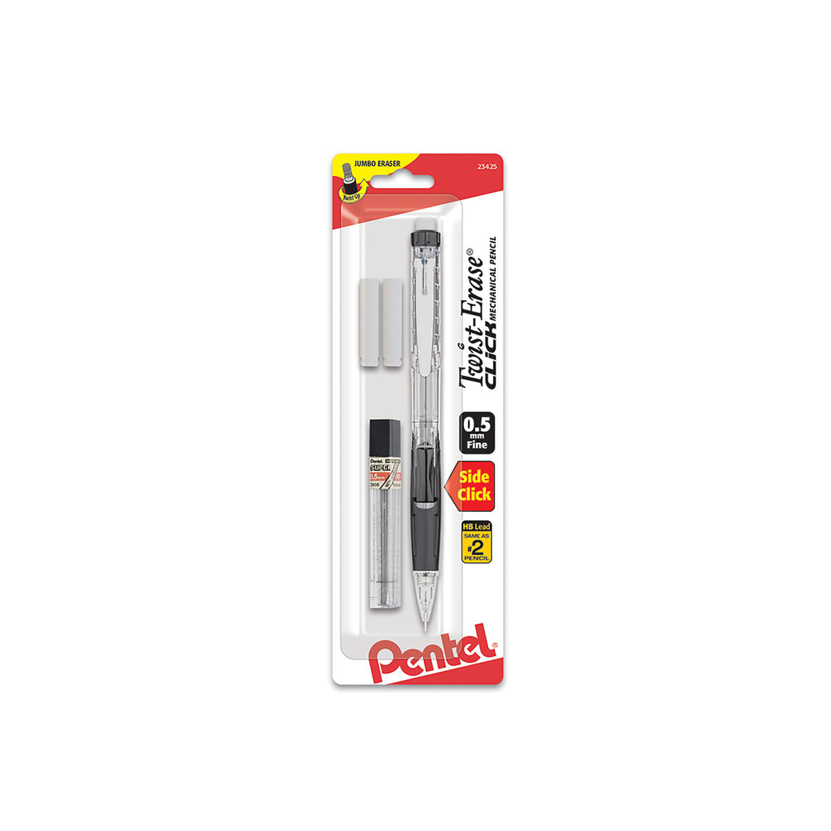 Twist-Erase® Click features clear barrels with color accents. Quick-click side button advances lead. Pre-loaded with Super Hi-Polymer® HB 0.5mm lead. Quick-click side button advances lead without interrupting your writing. Clear barrels with color accents for a stylish twist on pencils. Mistakes are no match for the larger than ordinary and long lasting twist-up eraser. Extended comfort grip (also latex-free), perfect no matter how you hold your pencil. Includes 1 pencil in assorted colors (no color choice) with lead and 2 erasers.