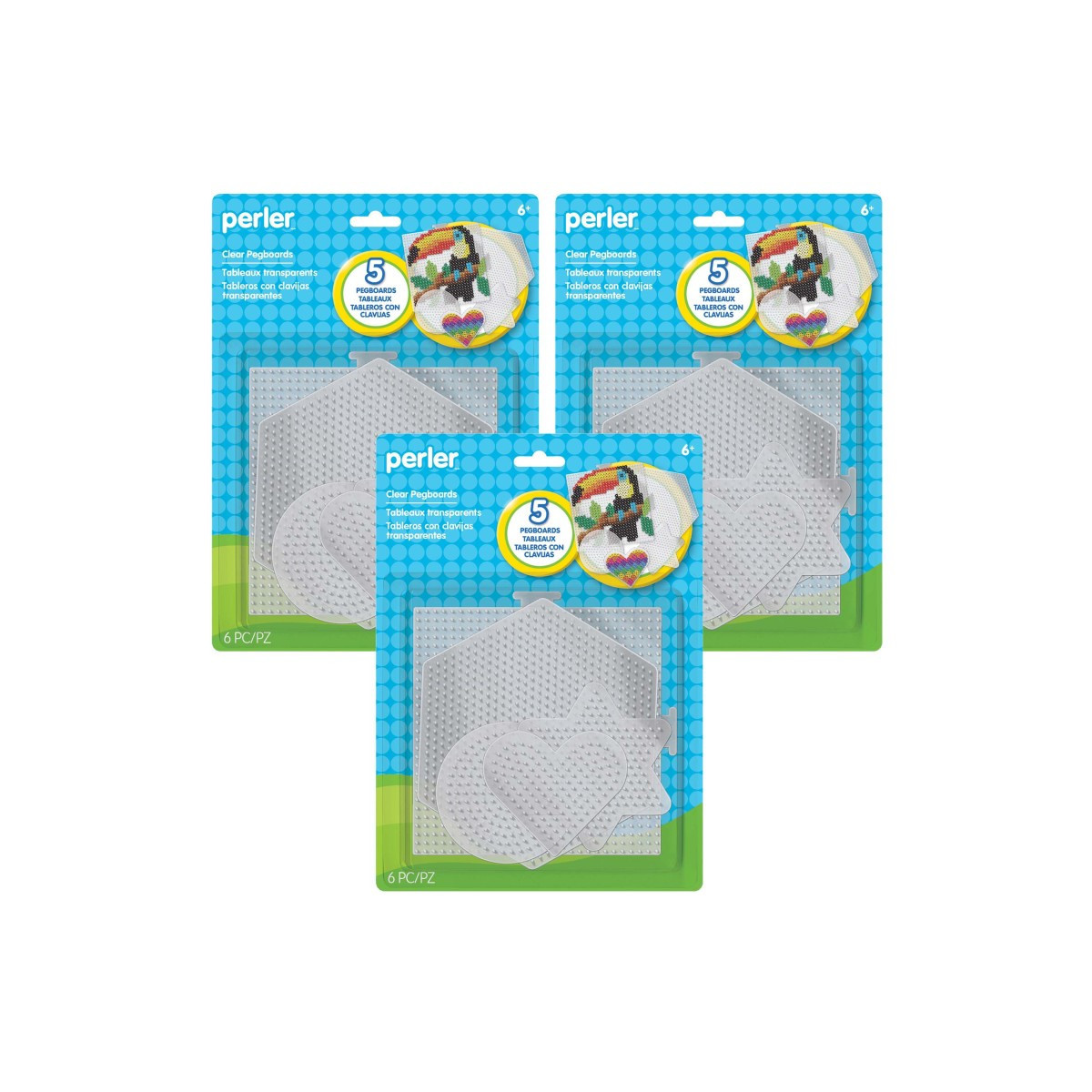 Our Small & Large Basic Shapes Clear Pegboards are designed for use with Perler Beads. The advantage with clear pegboards is that you can lay them right over a pattern for easy placement of beads. For ages 6 and up. Each Perler Small & Large Basic Shapes Clear Pegboard Set includes 5 pegboards: large clear square pegboard (5.7" square), large clear hexagon pegboard (6.25" x 5.5"), small clear circle pegboard (3.3" diameter), small clear star pegboard (3.5" x 4"), small clear heart pegboard (3.4" x 2.8"), ironing paper, and easy instructions. Sold as 3 complete sets for a total of 15 pegboards, ironing paper and instructions.