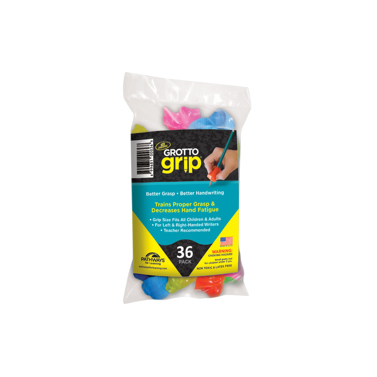 This patented, ergonomic pencil grip was designed and tested by pediatric occupational therapists specializing in handwriting. With consistent use, the Grotto Grip® trains the hand to form a proper grasp. Other leading ergonomic pencil grips may feel comfortable but they support the hand at the finger joints encouraging whole arm and hand movements; actually encouraging a static grasp pattern rather than the use of dynamic finger movements. Dynamic finger movements lead to more precision and increased writing speed. The Grotto Grip® actually activates the muscles in the palm of your hand to allow dynamic finger movements. The Grotto Grip® was designed with optimal firmness as recommended by occupational therapists to provide sufficient feedback to the fingers to maintain a proper grasp while writing. Grips that are too soft, lack finger guards or place the fingers too far from the pencil point may reinforce improper grasp habits. The Grotto Grip's® unique design places the hand and fingers in a position which shifts the support to the palm of the hand and facilitates the user to hold the wrist in an extended position; the proper way to hold a writing utensil. For both left & right-handed writers. Non Toxic & Latex Free. Assorted colors. Each pack includes 36 grips.