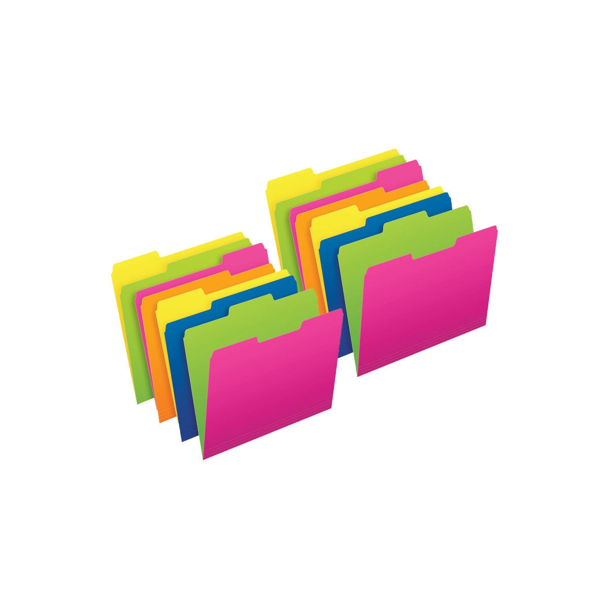 Pendaflex® Twisted Glow File Folders reverse to mismatched neon colors for twisted color-coding fun. Reversible folders in neon blue/yellow, green/pink, green/yellow and pink/orange color combos. 1/3-cut in assorted tab positions. Letter size. Each pack includes 12 folders. Sold as 2 packs for a total of 24 folders.