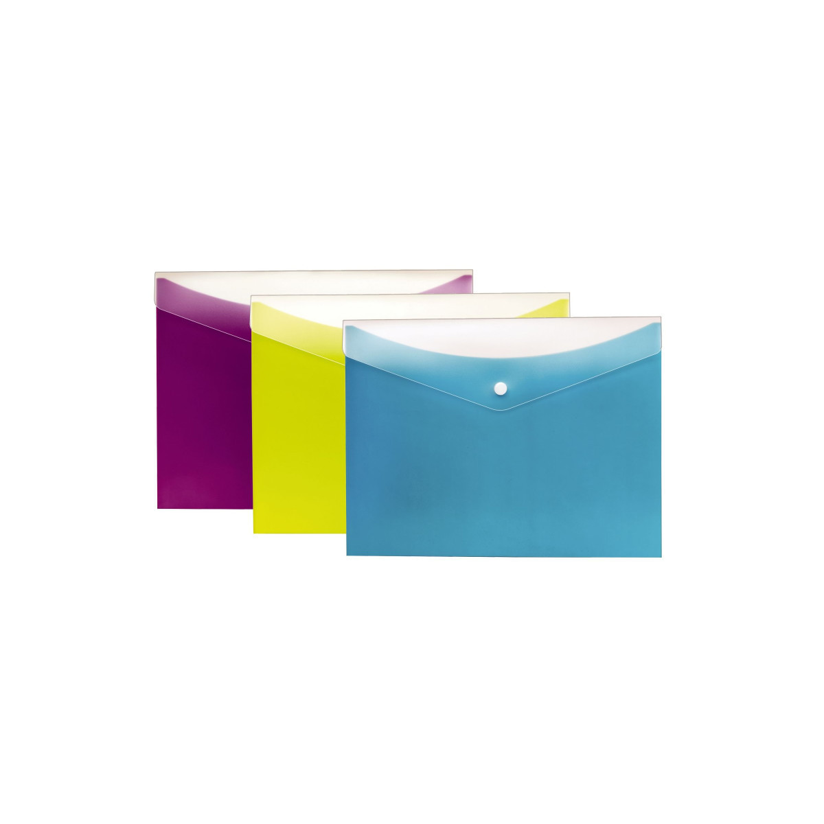 Poly envelope has additional pocket on back. Snap closure keeps contents secure. Top loading. Letter Size. Durable poly is water and tear-resistant. Assorted. Each pack includes 3 envelopes.