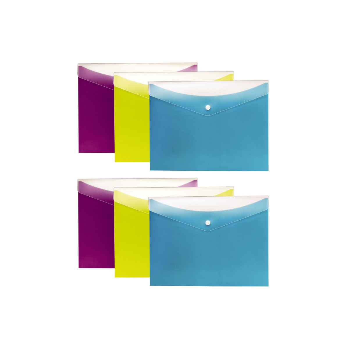 Poly envelope has additional pocket on back. Snap closure keeps contents secure. Top loading. Letter Size. Durable poly is water and tear-resistant. Assorted. Each pack includes 3 envelopes. Sold as 2 packs for a total of 6 envelopes.