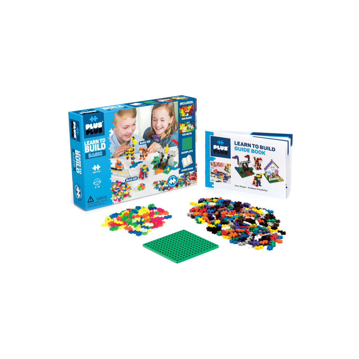 Plus-Plus is a whole new class of construction toy! One simple shape contains endless possibility and hours of fun. Each piece easily connects to the next and lets your imagination create colorful flat mosaics or work in 3-D to make more intricate builds. Even curves are possible thanks to the unique design of this deceptively simple shape! A perfect STEM toy to develop fine motor skills, focus and patience - as well as design, imagination and creativity! All Plus-Plus sets are compatible with each other and this open play set adds more pieces and colors to the collection for more possibilities and fun. The packaging is also reusable for storage and fun-on-the-go! This Learn to Build Basic set contains Basic Colors, including Red, Blue, Green, Yellow, Orange, Purple and more. Also includes 100 neon pieces, an Idea Guide Booklet and Baseplate for more building. BPA-free and phthalate-free. Designed and made in Denmark.