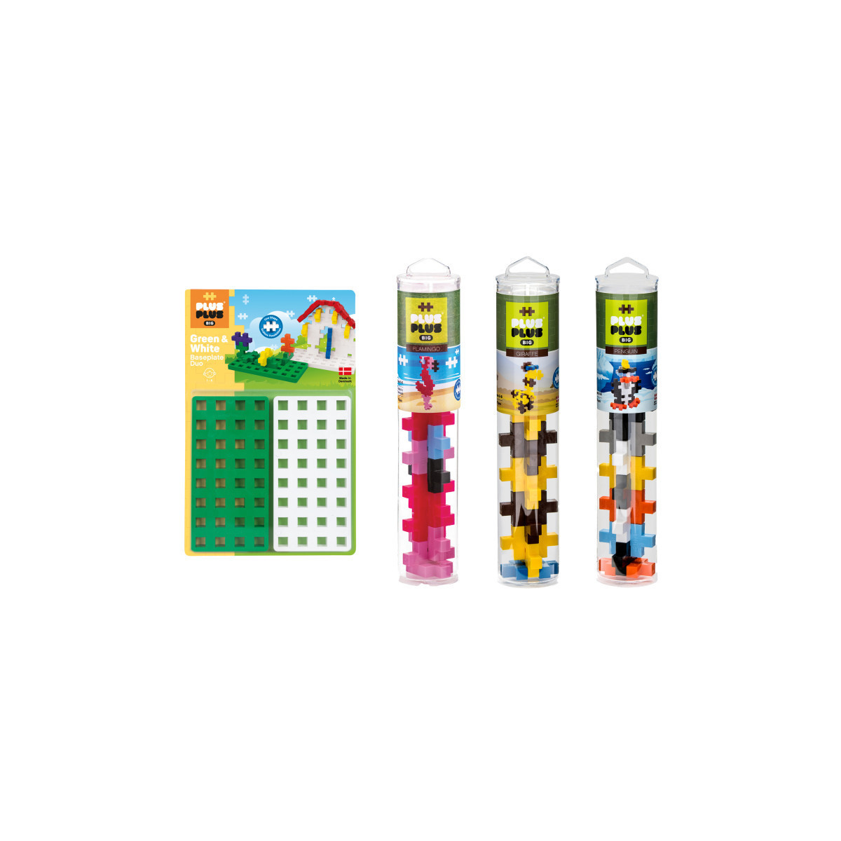 The BIG size is perfect for smaller hands or bigger ideas. This playset includes (3) 15-piece BIG tubes to build a Penguin, Giraffe, and Flamingo as well as a Green & White BIG baseplate duo.