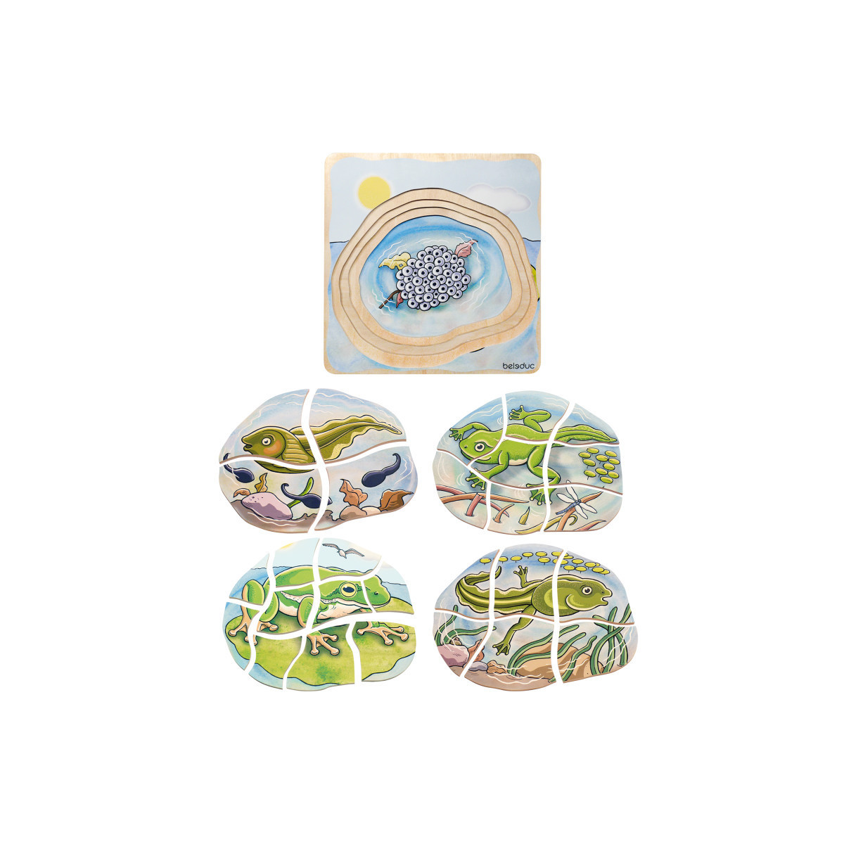 The development of animals is very different. With the help of the development puzzles with four layers, the development of the frog can be learned and understood.