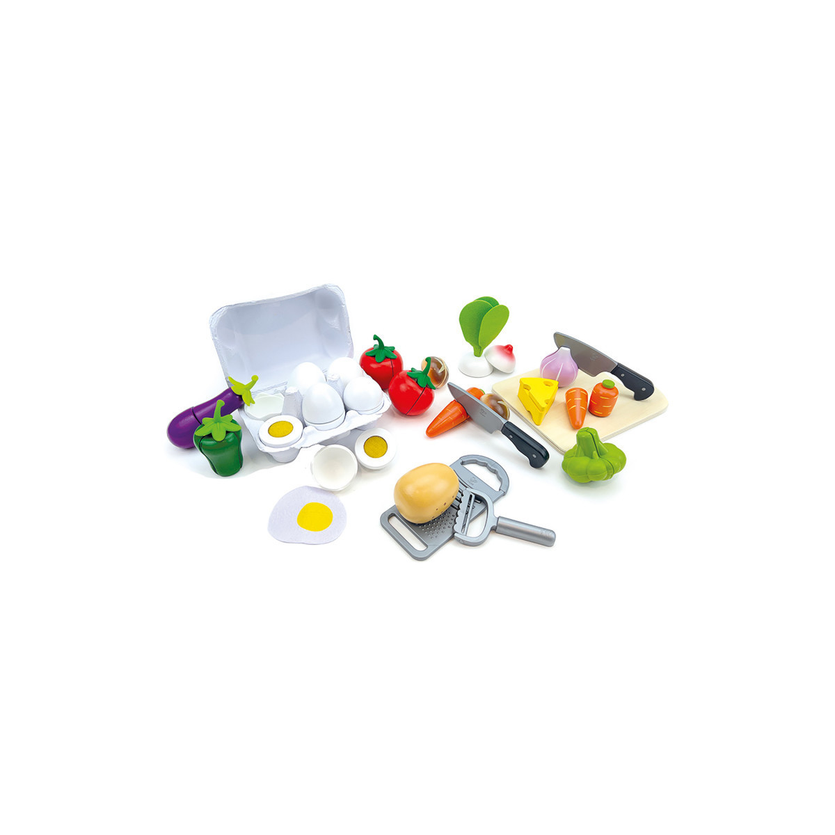 With the cooking essentials and vegetables set, tasty eating is fun! Cut the vegetables, peel the potatoes and grate the cheese - this is how preparing healthy meals is fun! The vegetables are kept together by hook & loop fasteners or magnets. The egg box contains 6 eggs - 3 hardboiled eggs and 3 fried eggs, so cooking is fun! 25 pieces.