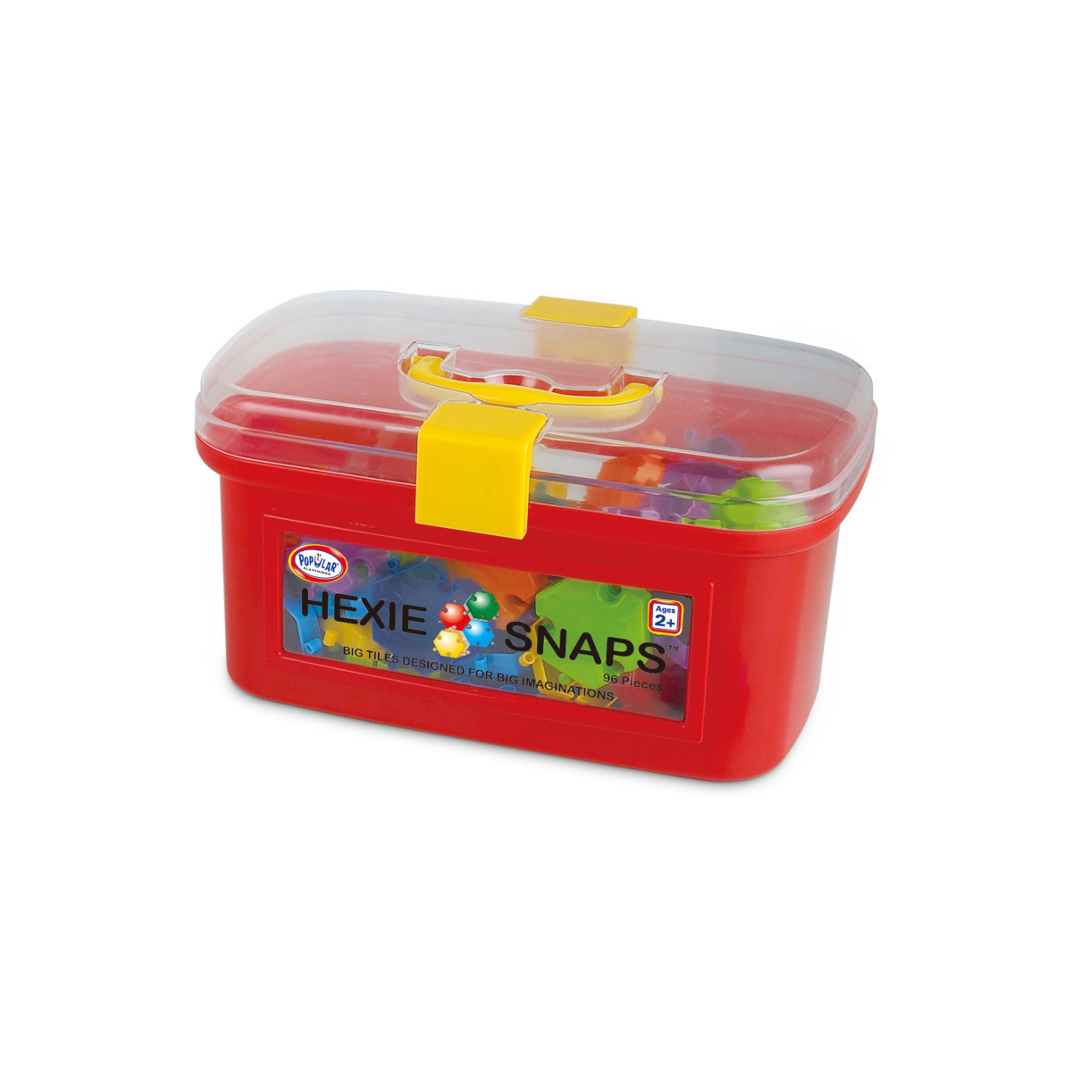Hexie-Snaps come in eight bright colors and are 2.5 inches across making them the ideal building toy for children under 3. The easy-to-manipulate pieces help develop basic motor skills, encourages creative thinking and enhances eye-hand coordination. Tiles snap together to form large-scale mosaics on the floor or table. Each set of 96 pieces come in a large plastic carrying tub for easy travel and storage, and includes 20 easy-to-follow design suggestions to help you get started. Ideal for teaching patterns, sorting and simple counting for young children. Follow the provided patterns. Easy to use for small hands. Each set includes 12 each of 8 colored tiles and 10 doubled sided challenges.