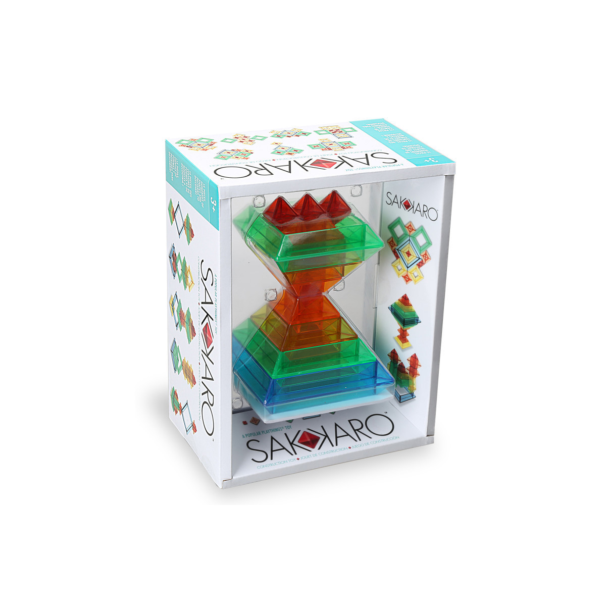 Sakkaro is a geometry toy that will light up a child's creativity! Its translucent colored pieces seem to magically blend together when you stack, nest and interlock them. Discover an endless variety of colorful shapes and patterns you can make on your own, or be inspired by our Idea Booklet which shows over 100 colorful patterns and shapes to make. Sakkaro is fun for the whole family. A simple geometric building system for young children though adults. Stacking and building is developmentally important. Includes 15 assorted blocks and booklet with over 100 challenges. Fun for all ages. Includes 15 assorted blocks and booklet with over 100 challenges.