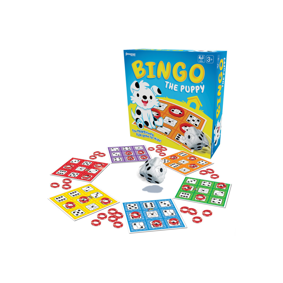 Everyone loves "Bingo the Puppy". Unleash this playful pup and watch him bounce, tumble and roll over! Then match his "spots" to a space on your game board and place a chip there. Be the first player to get three chips in a row and you win! Adorable first game. The puppy die is very unique, a soft squeezable, puppy die made in a perfect cube. Simple and fun to pick up and play, Kids will love Bingo the Puppy!