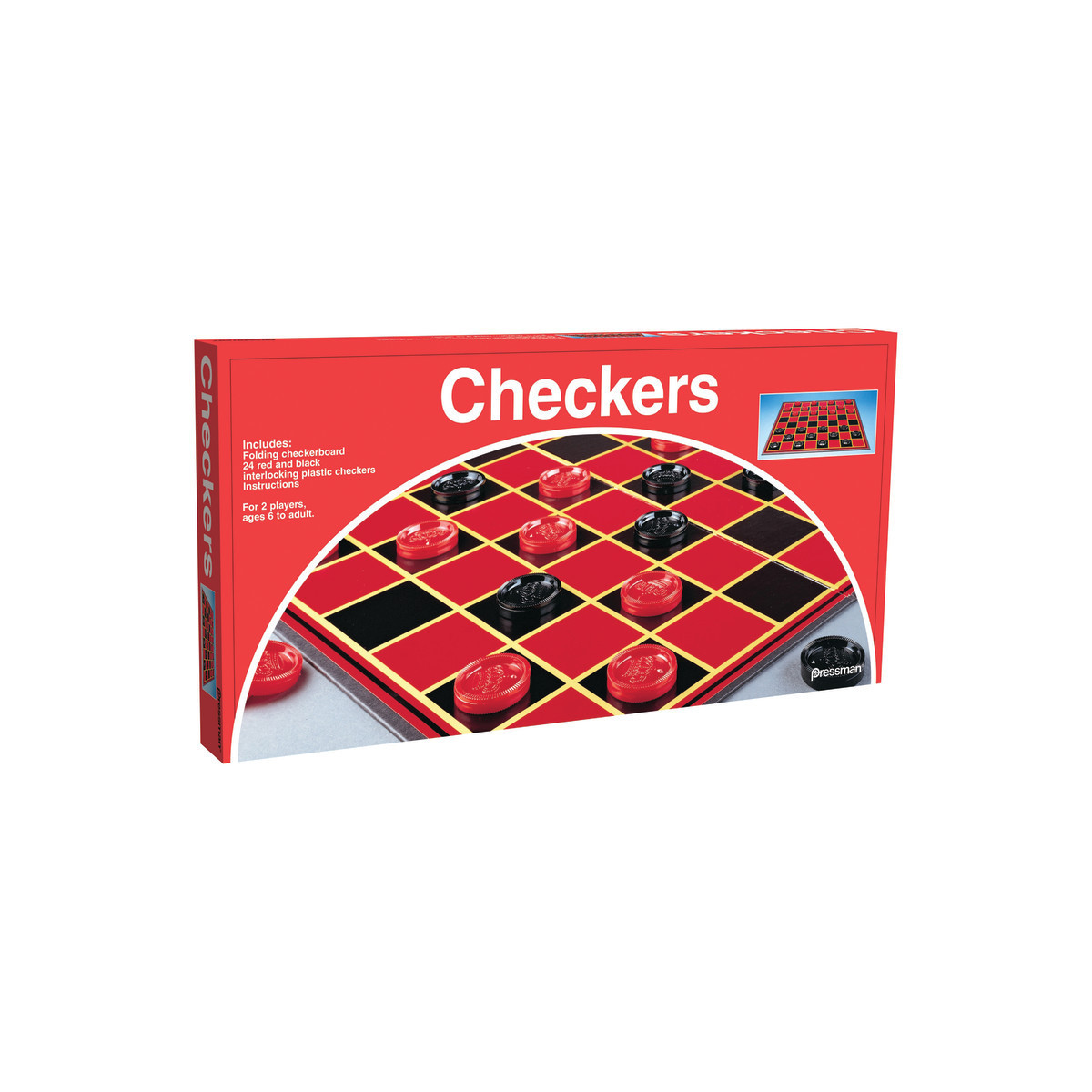 The all-time favorite! Includes folding game board, solid interlocking plastic checkers and rules. For 2 players, ages 6 to adult. THE OBJECT OF THE GAME: To capture all of the opponent's men, or block them so they cannot be moved. The checkers are moved diagonally and each player moves alternately one of his men, in order to 'capture' an opponent's checker, he must be able to jump (with his own man) over his opponent's checker when there is a vacant square behind. Single men may move diagonally forward. When a checker has reached the last row of his opponent's side, it becomes 'King' and then may move diagonally forward or backward. The 'King' is 'crowned' by placing another checker on top of it.