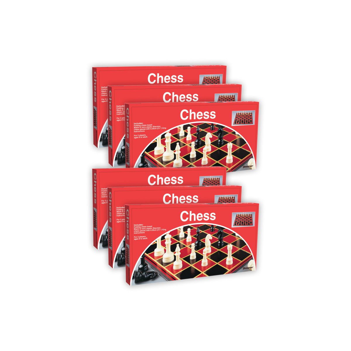 This is the perfect chess set to add to your family game collection. Includes folding chess board, full-sized plastic Staunton chess figures with 2.5" King and rules. For 2 players, ages 8 to adult. Sold as a pack of 6 identical games.