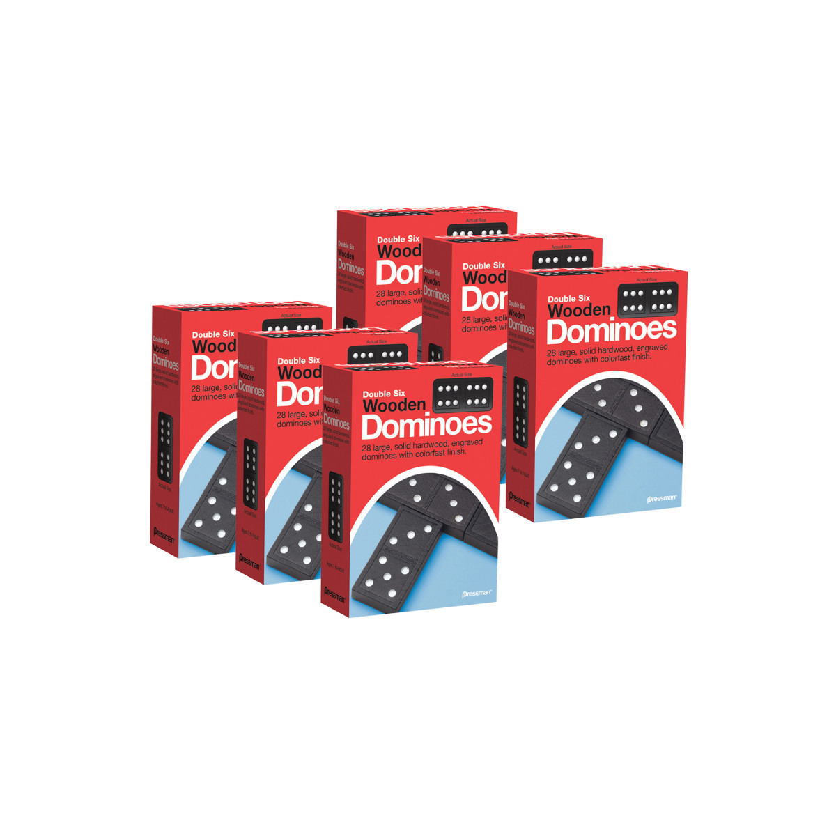 This nostalgic wooden domino set features bright white painted dots on a rich dark black wooden domino. This set is a perfect addition to any game collection. For 2 to 6 players, ages 5 and up. Each game includes 28 Large, Solid Hardwood, Engraved Dominoes with Colorfast Finish and Complete Instructions. Sold as 6 full sets of dominoes.