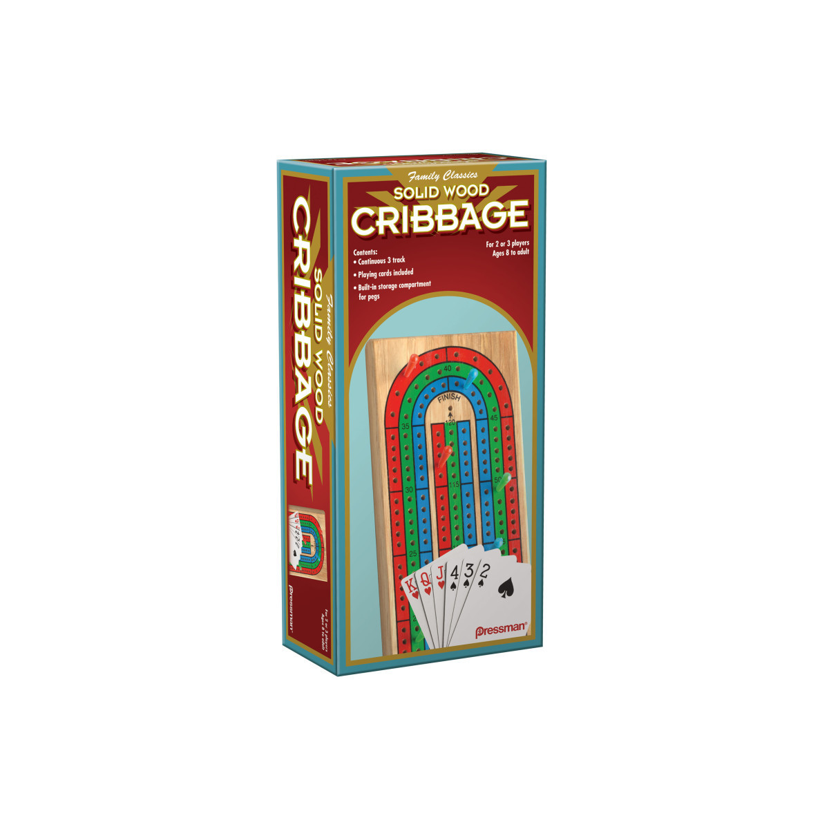 Players use card combinations to peg points along the wood cribbage board. This handsome wood version can be played by 2 or 3 players and folds to a handy take-anywhere size. For 2 to 3 players, ages 8 and up. Game includes wooden cribbage board with storage compartment, continuous 3 track, 1 deck playing cards, 9 pegs, and complete instructions.