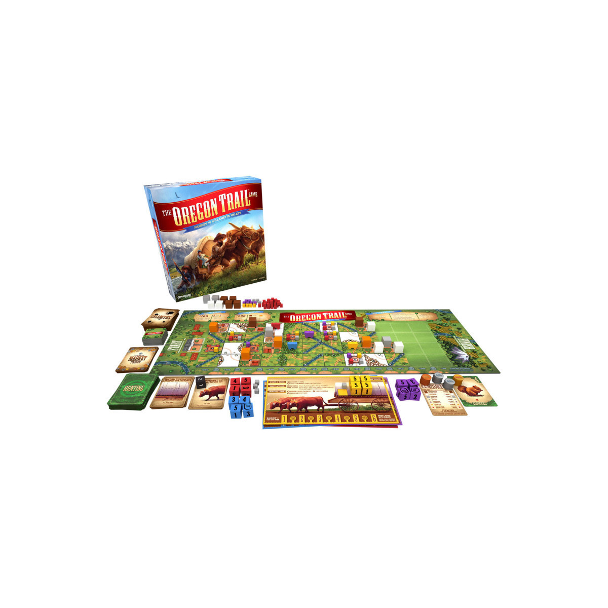 It's 1844: You and your family have joined a wagon train in Independence, MO that is about to head to Willamette Valley to find your fortune in the West! Players will place tiles to discover the trails, rivers, forts, and towns ahead of them that they will move through to this new land. This scenic journey would almost be perfect... if it wasn't for the disease, drowning, rattlesnakes and other hazards that will plague you along the way. You'll need to hunt for food to avoid starvation, and with limited wagon space, you may need to choose between supplies and family members to keep moving along the trail. Until, eventually, you find yourself safe, in Willamette Valley. Relive your fond memories of one of the world's most beloved computer games as you race your friends to victory in "The Oregon Trail: Journey to Willamette Valley." For 2-4 players, ages 13 and up.