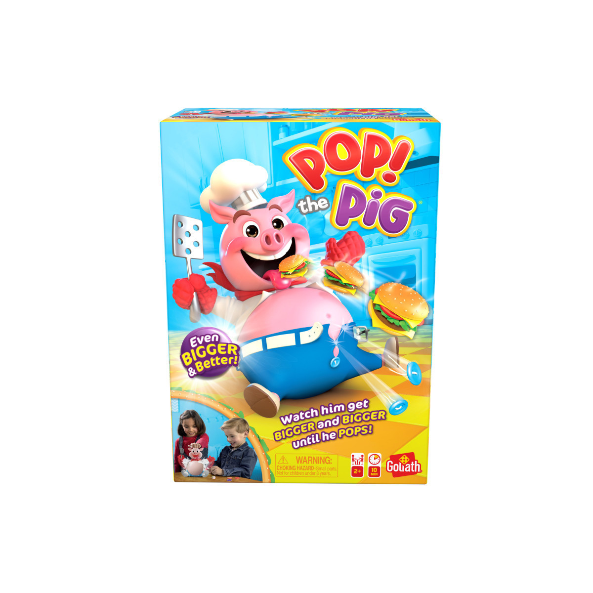 Pop the Pig is an international preschool classic that is adored by millions of children - it's been a top-selling preschool game according to data collected by NPD! Kids spin the spinner, pop a hamburger into the pig's mouth and push down on his head. The more they pump, the more his belly grows until . . . pop! Kids love the suspense as they watch his belly grow; the player who makes his belly burst wins the game. Children can quickly reset the game with one pump of the pig's head and experience consistent belly-busting gameplay each and every time. Pop the Pig provides hours of fun and is completely kid powered (no batteries needed). For added convenience, all pieces can be stored inside the pig. For 2-6 players, ages 4 and up. From the makers of Doggie Doo, Gooey Louie, Jumping Jack, Catch the Fox, and Googly Eyes.