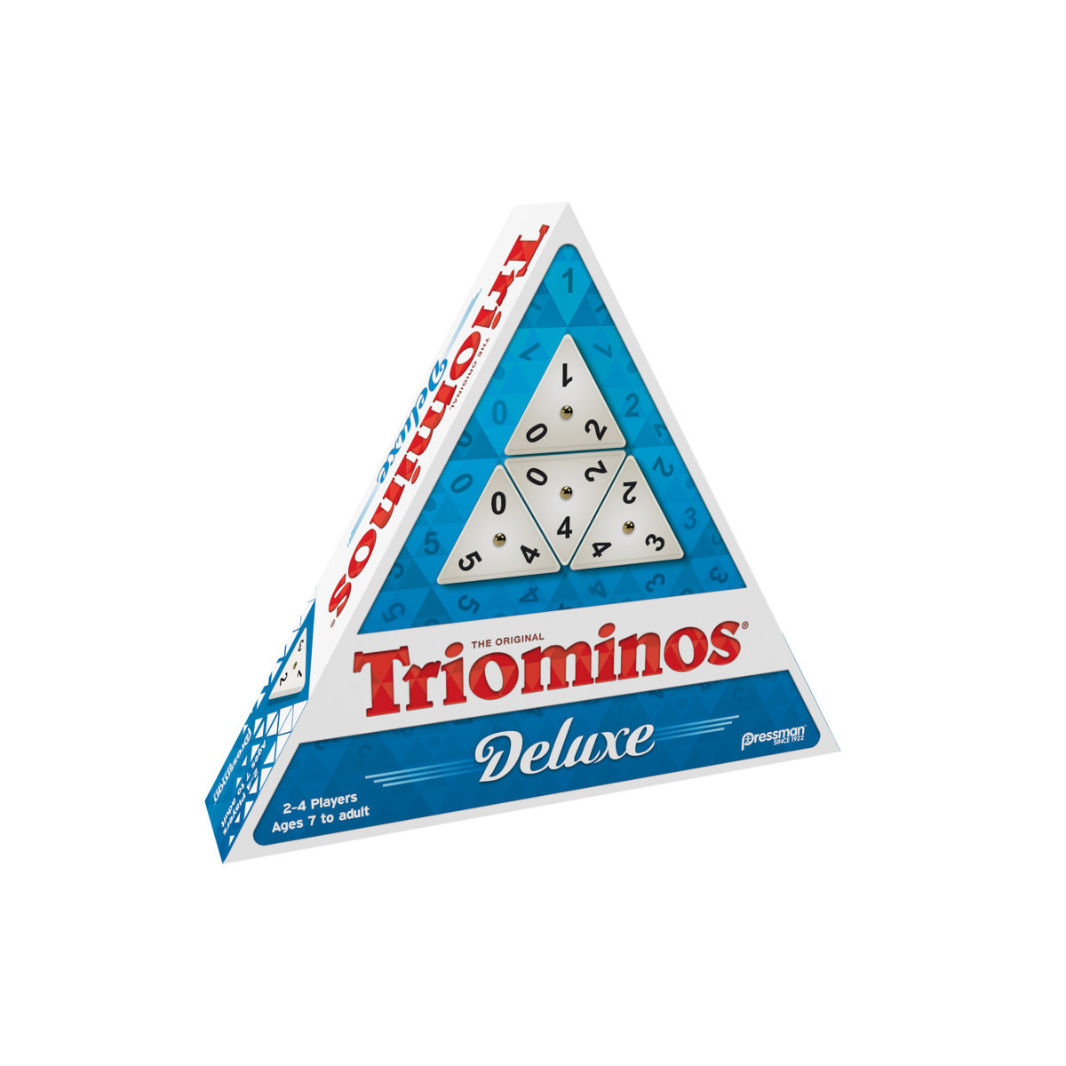 The classic triangular domino game! Score points by matching numbers on the three-sided pieces. Contains 56 playing tiles with brass spinners, 4 plastic racks, and complete instructions. For 2 to 4 players, ages 7 and up.