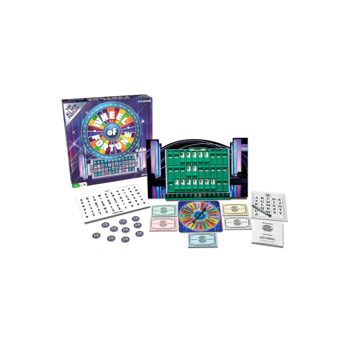 Bring the fun of the most popular game show in history to your next game night with the Wheel of Fortune! This 4th edition features 100 brand new puzzles from the beloved show, all written by the Wheel of Fortune staff, as well as the classic puzzle board and wheel. Earn money by spinning the wheel and solving word puzzles on the puzzle board. The player with the most money after four rounds is the winner. So what are you waiting for - spin the wheel, buy a vowel, and get to guessing! For 2-4 players, ages 8 and up.
