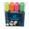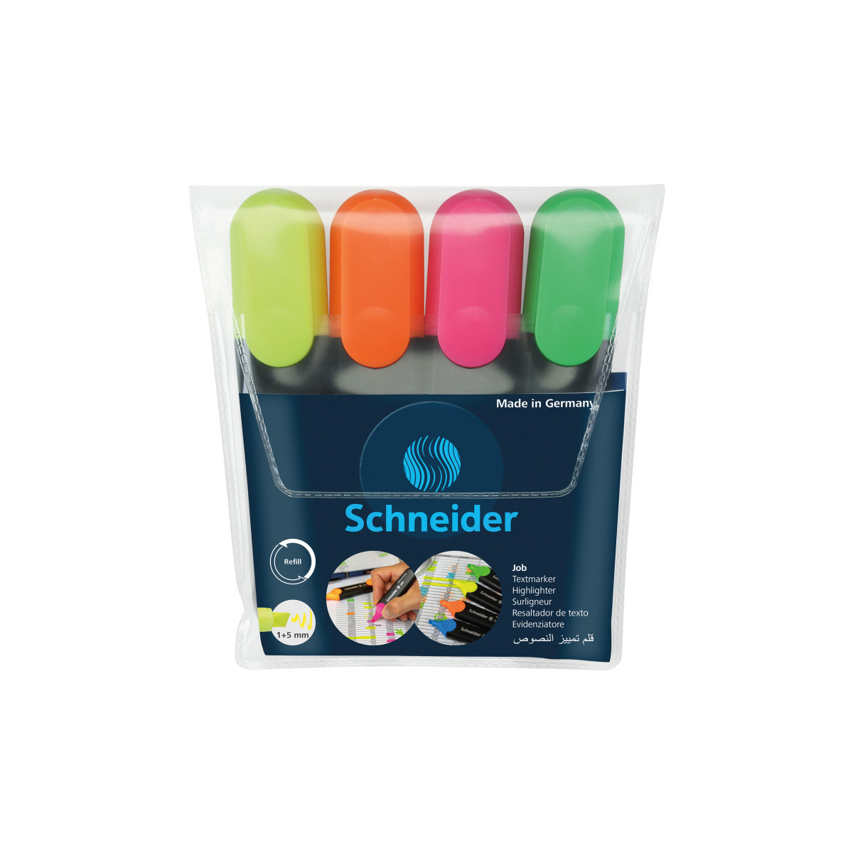 The Schneider Job Highlighter features universal ink with brilliant performance and good lightfastness on standard, copy, and fax paper. Chisel tip highlights line widths in two sizes, approximately 1 mm and 5 mm, ideal for creative work, school, or office use. The anti-evaporation polypropylene barrel is guaranteed to keep the highlighter fresh for two years. The slimmer shape with rounded edges is perfect for a pocket or pencil case. The cap with a practical, sturdy clip fits neatly on either end of the barrel. With its large ink reservoir, the Job Highlighter can highlight more than 15,000 words. The smart highlighter was awarded the renowned iF and red dot design awards. Includes reusable wallet with four (4) highlighters: yellow, orange, pink and green.
