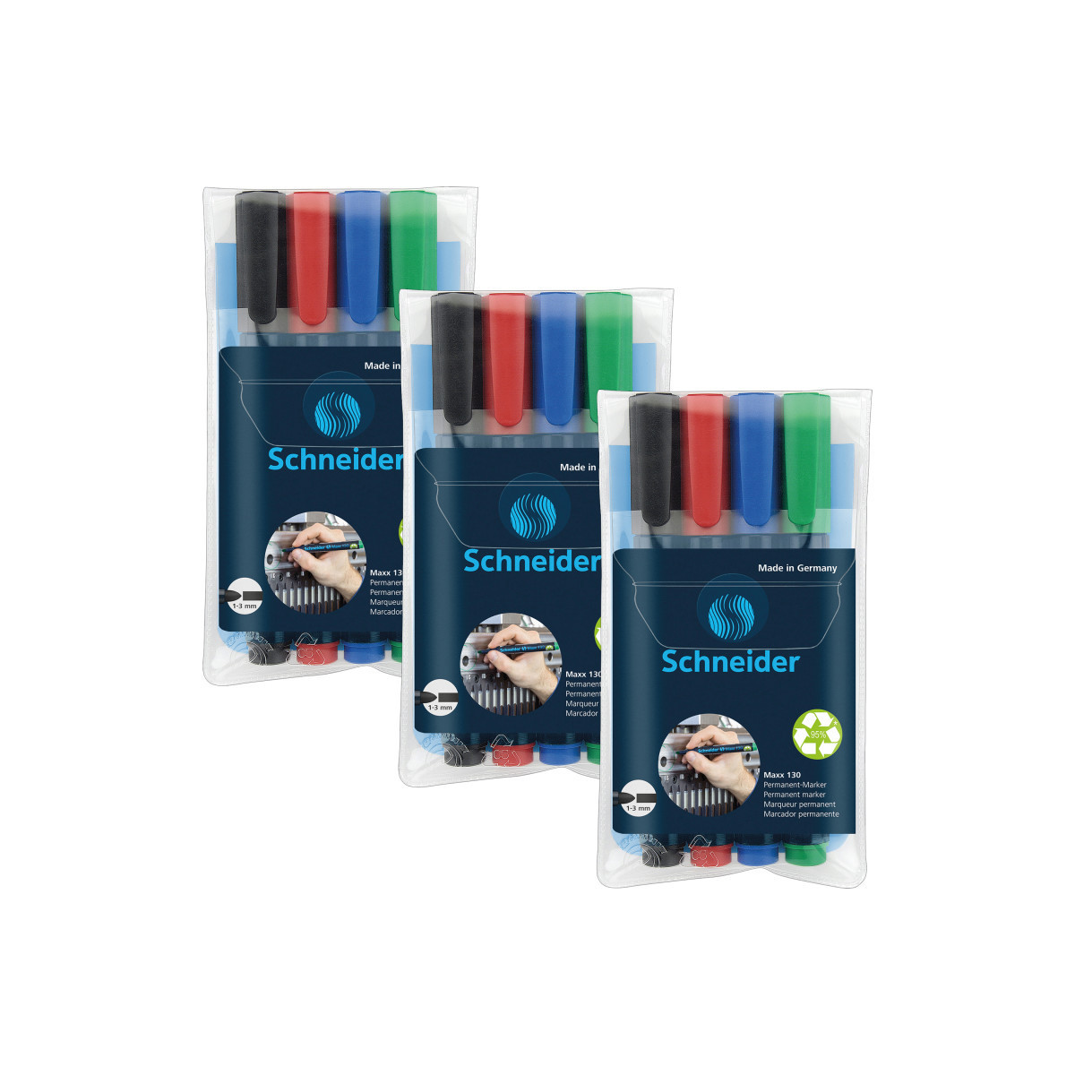 The Schneider Maxx 130 is a permanent marker for writing on almost all types of materials. It has a low odor and is free of toluol and xylol. The bullet tip writes in two line widths, 1 & 3 mm. With its quick-drying, waterproof, and highly light-resistant format, the Maxx 130 will not dry out, even if the cap is left off for 2-3 days. The Schneider Maxx 130 has a practical clip cap and can be refilled using Maxx 640 refill station. Housing made of 95% recycled plastic and made in Germany. Each pack includes 4 markers of assorted ink colors: Black, Red, Blue and Green. Sold as 3 packs for a total of 12 markers.
