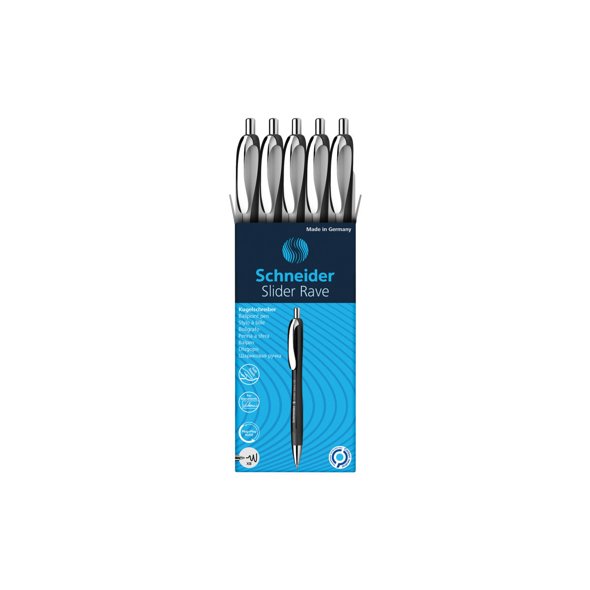 Schneider Slider Rave, the quick-start, page-surfing ballpoint pen, is now available in a special design using Viscoglide® technology for an extraordinarily smooth and gliding writing experience. Contains one (1) box of five (5) Slider Rave White-Black Barrel Refillable + Retractable Ballpoint Pens. Blue ink is waterproof according to ink standard ISO 12757-2 and writes in an approximate 1.4 mm, Extra Broad (XB) line width. Quick-drying, smudge-proof ink, even on smooth paper, and when later highlighted. Ergonomic shape and generously rubberized surface promote a firm, yet relaxed, hold for tireless writing without the hand fatigue for a distinct feel and natural writing movement. Wear-resistant stainless steel tip enhances ink flow, guarantees the large ink supply can be fully used and does not smear or grind across the page. Compatible with the clever universal Plug+Play refill system, the Slider Rave can use a variety of refill formats, including the giant Slider 755 XB refill. Sturdy metal clip for secure mobile use. Produced CO2 Neutral to fully offset unavoidable emissions. Made in Germany.