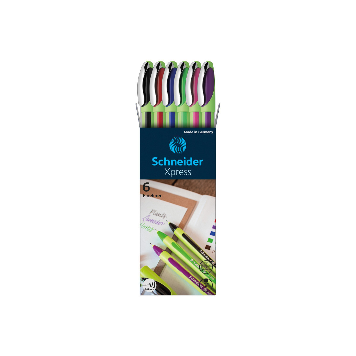 The Schneider Xpress Fineliner, the premium fineliner for a wonderfully smooth, expressive writing experience. The 0.8 mm, metal-encased, stainless-steel fiber tip glides across the page and the durability of the nib is ideal for use with rulers and templates. Its progressive design with rubberized, ergonomic barrel enables more comfortable writing sessions without the hand fatigue. Solid metal clip fits securely on either end of the barrel. Cap-off ink does not run dry even if the cap is removed for 2-3 days. Pen barrel made with 85% recycled plastic. Contains one (1) box of six (6) assorted Xpress Fineliner Pens in each of the following colors: Black, Blue, Red, Green, Violet, and Pink. Ink is light resistant and waterproof according to ink standard ISO 14145-2. Made in Germany.